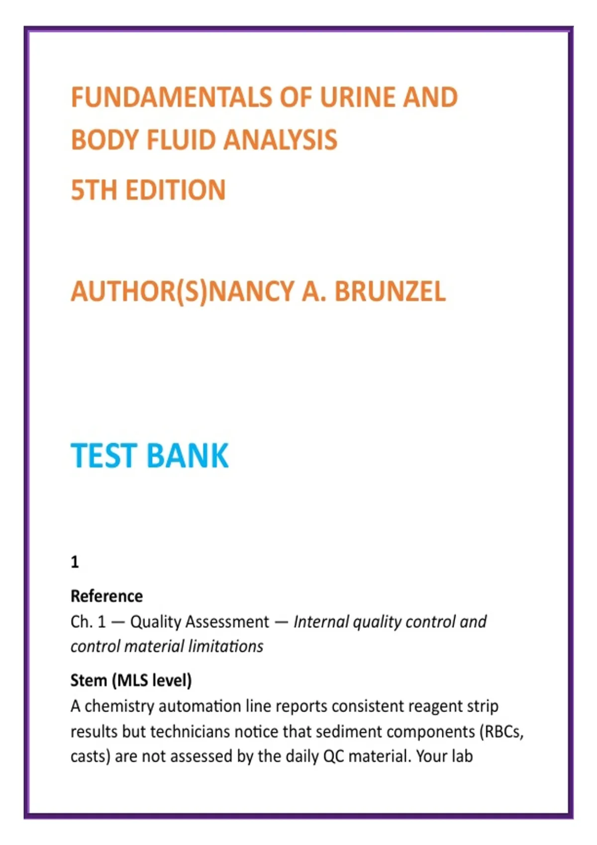 Fundamentals of Urine & Body Fluid Analysis Test Bank | Brunzel 5th Edition | Nursing & MLS Exam MCQs 2026 2️⃣ SEO Product Description (200–300 words) Master urinalysis and body fluid diagnostics with this comprehensive, exam-ready test bank based on Fundamentals of Urine and Body Fluid Analysis, 5th Edition by Nancy A. Brunzel, the gold-standard authority in urine and body fluid laboratory science. This digital resource delivers full textbook coverage with 20 clinically accurate, exam-style MCQs per chapter, each paired with detailed, evidence-based rationales that explain why an answer is correct—not just what is correct. Questions are written to reflect real-world laboratory ambiguity, emphasizing diagnostic reasoning, specimen integrity, microscopic interpretation, and laboratory decision-making aligned with MLS/MLT certification exams and nursing laboratory coursework. Designed for efficiency and depth, this test bank helps learners identify weak areas quickly, reinforce key concepts, and build confidence in interpreting urinalysis and body fluid results under exam conditions. Every item integrates laboratory data with underlying pathophysiology to strengthen clinical–laboratory correlation, a critical skill for both students and practicing professionals. Ideal for: Medical Laboratory Science (MLS / CLS) programs Medical Laboratory Technician (MLT) courses Clinical Pathology & Diagnostic Laboratory Science Urinalysis & Body Fluids laboratory courses Nursing laboratory diagnostics modules What’s Included: Full chapter-by-chapter coverage of Brunzel 5th Edition 20 high-quality MCQs per chapter Detailed rationales with clinical interpretation Urinalysis, renal pathology, and body fluid analysis scenarios Exam-focused format for certification and competency readiness Whether you’re preparing for exams, reinforcing coursework, or building diagnostic confidence, this test bank is a time-saving, high-yield study tool trusted across laboratory science education. 3️⃣ 8 High-Value SEO Keywords fundamentals of urine and body fluid analysis test bank Brunzel 5th edition test bank urinalysis MCQs with rationales body fluid analysis study guide MLS urinalysis exam questions MLT urinalysis test bank nursing laboratory diagnostics test bank clinical laboratory science urinalysis MCQs 4️⃣ 10 Hashtags #UrinalysisTestBank #BodyFluidAnalysis #MedicalLaboratoryScience #MLSExamPrep #MLTStudyGuide #ClinicalPathology #NursingDiagnostics #LaboratoryScienceEducation #UrinalysisMCQs #Brunzel5thEdition