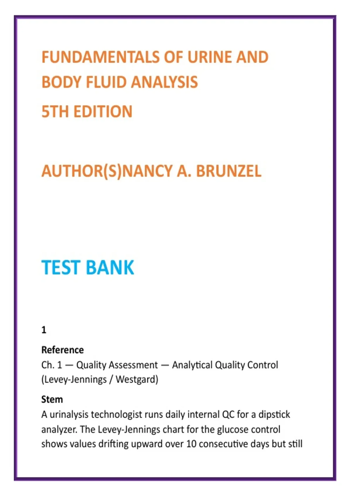 Fundamentals of Urine and Body Fluid Analysis Test Bank | Brunzel 5th Edition | Nursing & MLS Exam MCQs 2026 2️⃣ SEO Product Description (200–300 words) Master diagnostic urinalysis and body fluid interpretation with this comprehensive digital test bank developed directly from Fundamentals of Urine and Body Fluid Analysis, 5th Edition by Nancy A. Brunzel—the gold-standard reference in clinical laboratory science education. This professionally written test bank delivers full chapter-by-chapter coverage of the textbook, with 20 high-quality, exam-style multiple-choice questions per chapter, each paired with accurate answers and detailed, evidence-based rationales. Questions are designed to reflect the analytical depth and diagnostic ambiguity encountered in real clinical laboratories, ensuring strong preparation for both academic assessments and certification exams. Built for Medical Laboratory Science (MLS/CLS) and Medical Laboratory Technician (MLT) programs, this resource also supports nursing laboratory diagnostics coursework, clinical pathology instruction, and urinalysis/body fluids laboratory modules. Every question emphasizes clinical–laboratory correlation, specimen integrity, microscopic identification, and correct interpretation of abnormal findings. Authored in alignment with modern MLS/MLT exam standards, this test bank helps learners reinforce core concepts, identify knowledge gaps, and improve exam performance with confidence. Key Features FULL coverage of Fundamentals of Urine and Body Fluid Analysis (5th Edition) 20 exam-style MCQs per chapter Detailed rationales grounded in laboratory best practices Clinical correlation scenarios for urinalysis and body fluids Emphasis on specimen handling, QC, microscopy, and diagnostic interpretation Ideal for MLS/MLT students, nursing diagnostics, and clinical pathology courses Developed with the authority of Nancy A. Brunzel, this test bank is an essential study tool for mastering urinalysis and body fluid diagnostics. 3️⃣ 8 High-Value SEO Keywords fundamentals of urine and body fluid analysis test bank Brunzel 5th edition test bank urinalysis MCQs for MLS body fluid analysis study guide MLS urinalysis exam questions nursing urinalysis test bank medical laboratory science MCQs urine microscopy practice questions 4️⃣ 10 Optimized Hashtags #UrinalysisTestBank #BodyFluidAnalysis #MedicalLaboratoryScience #MLSExamPrep #MLTStudyGuide #ClinicalPathology #LaboratoryDiagnostics #UrineMicroscopy #NursingLabSkills #DiagnosticTesting
