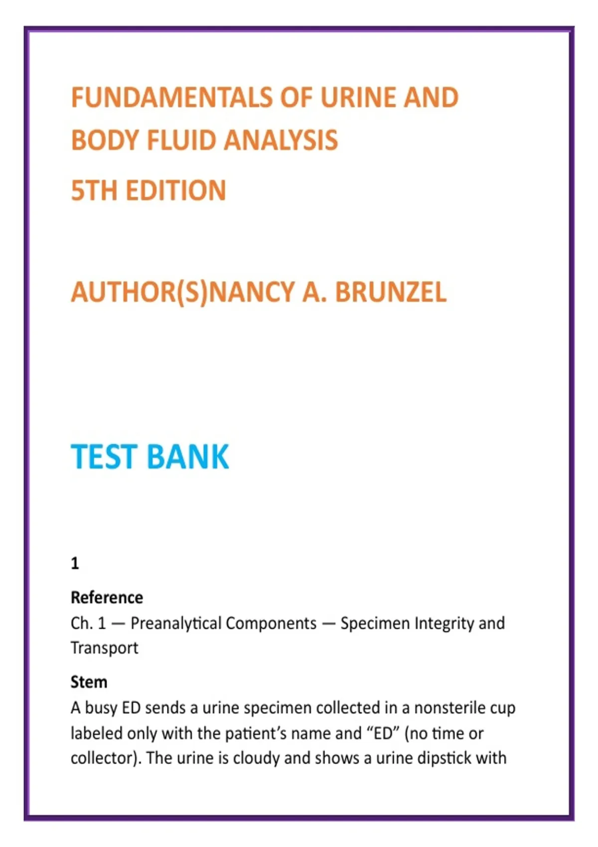 Fundamentals of Urine & Body Fluid Analysis Test Bank | Brunzel 5th Edition | Urinalysis MCQs | MLS & Nursing 2026 2️⃣ SEO Product Description (200–300 words) Master urinalysis and body fluid diagnostics with this comprehensive, exam-focused test bank designed to accompany Fundamentals of Urine and Body Fluid Analysis, 5th Edition by Nancy A. Brunzel, a globally recognized authority in clinical urinalysis and laboratory diagnostics. This digital resource provides full chapter-by-chapter coverage of the textbook, featuring 20 rigorously developed, exam-style MCQs per chapter. Each question emphasizes clinical interpretation, diagnostic reasoning, and laboratory decision-making, mirroring the complexity encountered in real clinical laboratories and certification exams. Every question includes a verified correct answer with detailed, evidence-based rationales, helping learners understand not just what is correct, but why. Clinical scenarios integrate urinalysis chemistry, microscopic findings, body fluid analysis, renal pathology, specimen integrity, quality assessment, and safety, ensuring strong clinical–laboratory correlation. Designed as a time-efficient, high-yield study tool, this test bank reinforces key concepts, sharpens diagnostic accuracy, and builds confidence for exams, practicals, and clinical rotations. Ideal for: Medical Laboratory Science (MLS / CLS) programs Medical Laboratory Technician (MLT) courses Urinalysis & Body Fluids laboratory courses Clinical Pathology and Diagnostic Laboratory Science Nursing laboratory diagnostics modules Key Features: Full coverage of all chapters and diagnostic sections 20 MCQs per chapter aligned with MLS/MLT and nursing coursework Detailed rationales with clinical correlations Emphasis on urinalysis, body fluids, microscopy, and specimen handling Exam-ready format for certification and academic success If you are serious about mastering urine and body fluid analysis, this Brunzel-aligned test bank is an essential study companion. 3️⃣ 8 High-Value SEO Keywords fundamentals of urine and body fluid analysis test bank Brunzel 5th edition test bank urinalysis MCQs with rationales body fluid analysis study guide MLS urinalysis exam questions MLT urinalysis test bank clinical laboratory science MCQs nursing urinalysis diagnostics study 4️⃣ 10 Optimized Hashtags #UrinalysisTestBank #BodyFluidAnalysis #MedicalLaboratoryScience #MLSExamPrep #MLTStudents #ClinicalPathology #LaboratoryDiagnostics #NursingDiagnostics #BrunzelUrinalysis #LabScienceEducation