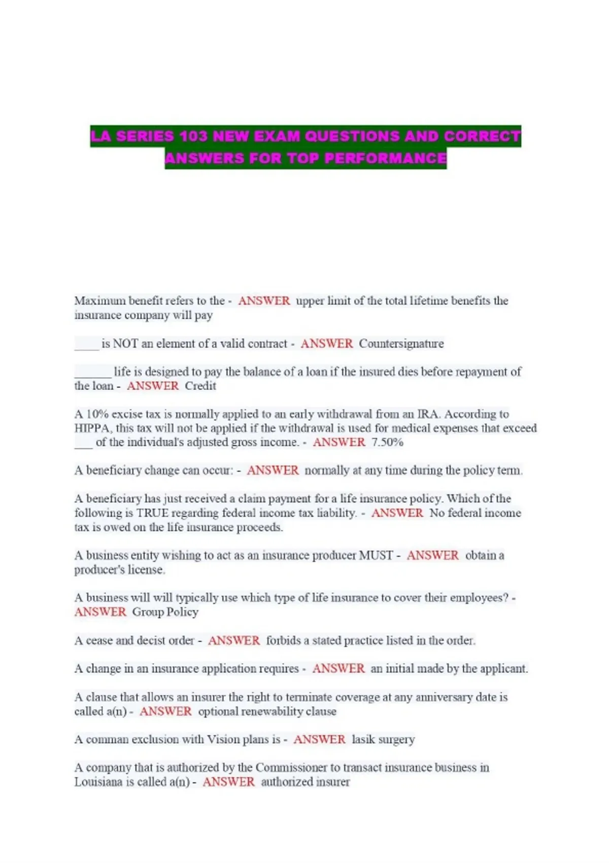 LA SERIES 103 NEW EXAM QUESTIONS AND CORREСТ