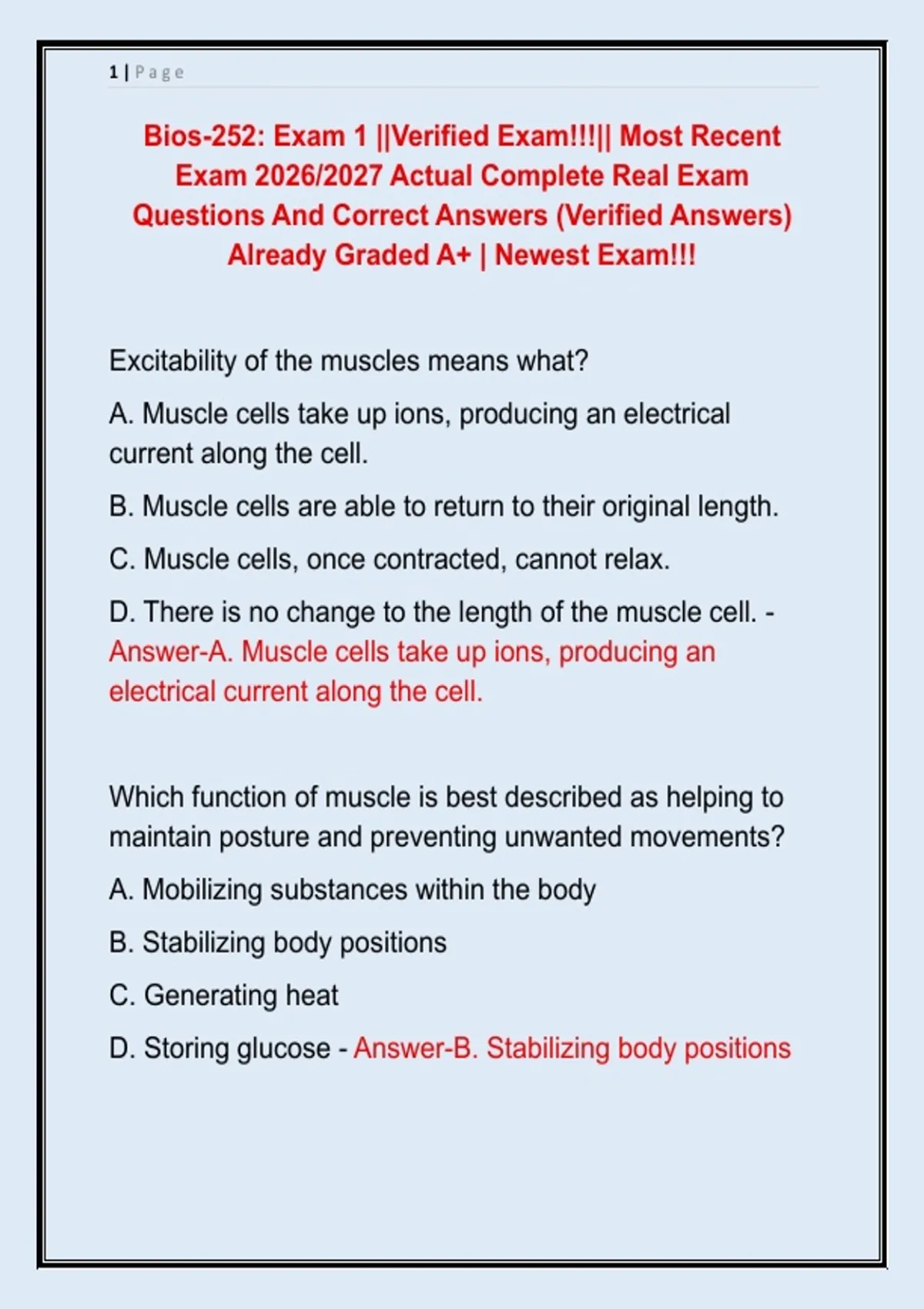 Bios-252: Exam 1 ||Verified Exam!!!|| Most Recent Exam 2026/2027 Actual Complete Real Exam Questions And Correct Answers (Verified Answers) Already Graded A+ | Newest Exam!!!