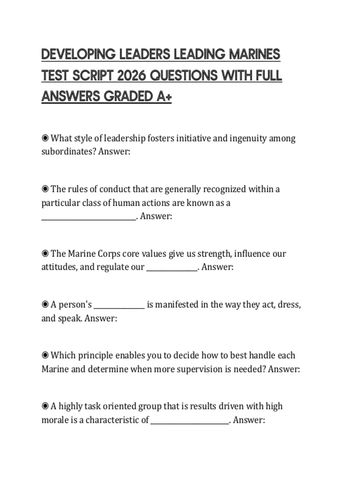 DEVELOPING LEADERS LEADING MARINES TEST SCRIPT 2026 QUESTIONS WITH FULL ANSWERS GRADED A+