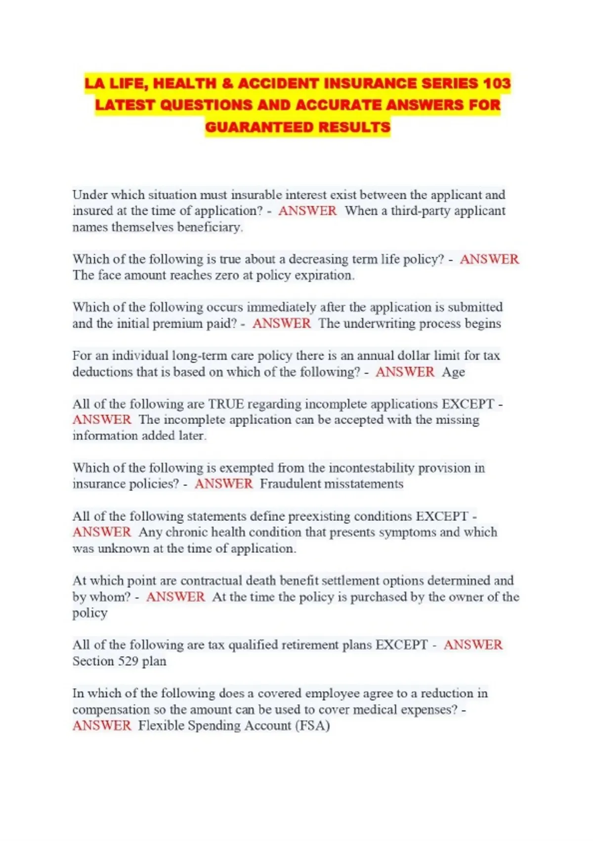 LA LIFE, HEALTH & ACCIDENT INSURANCE SERIES 103 LATEST QUESTIONS AND ACCURATE ANSWERS FOR GUARANTEED RESULTS...