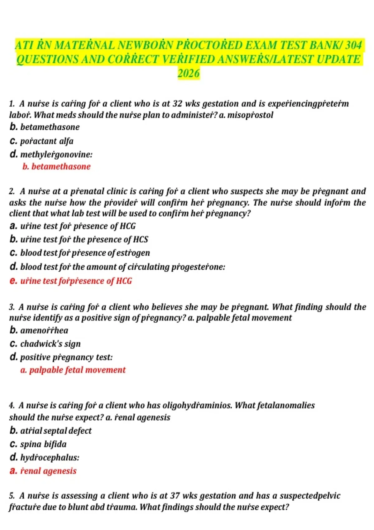 This comprehensive 2026 "Full Test Bank" provides exhaustive coverage for the ATI RN Maternal Newborn Proctored Exam. Optimized for the Next Generation NCLEX (NGN), this resource features 304 high-yield questions with verified answers, focusing on the critical management of labor, prenatal diagnostics, and postpartum complications. The manual is designed to help students distinguish between presumptive, probable, and positive signs of pregnancy and to manage high-risk obstetric scenarios. Detailed questions emphasize diagnostic confirmation and fetal monitoring. For example, it clarifies that while a urine test for HCG is used to screen for pregnancy, a positive sign of pregnancy is definitively confirmed by palpable fetal movement by a clinician or the visualization of the fetus via ultrasound. It also identifies that Oligohydramnios (insufficient amniotic fluid) is highly associated with fetal renal agenesis, as fetal urine contributes significantly to amniotic fluid volume. The bank provides critical pharmacological protocols for maternal-fetal health. It identifies Betamethasone as the priority medication for a client in preterm labor at 32 weeks to stimulate fetal lung surfactant production. Furthermore, it addresses emergency obstetric care, noting that in the event of blunt abdominal trauma with a suspected pelvic fracture, the nurse must prioritize assessing for uterine contractions and fetal heart rate patterns to detect placental abruption or fetal distress. Furthermore, the resource details neonatal assessment and stabilization. It defines the APGAR scoring system, where a score of less than 3 indicates severe distress requiring immediate resuscitation. It also lists normal newborn parameters, such as a weight of 2500–4000g, a heart rate of 110–160 bpm, and a blood pressure of 60–80/40–50 mmHg. Derived from the latest ATI curriculum, this resource is optimized for mastering the nuances of subinvolution, newborn reflexes, and the transition to extrauterine life. ATI RN Maternal Newborn Proctored Exam 2026, OB Nursing Test Bank, Positive Signs of Pregnancy, Oligohydramnios and Renal Agenesis, Betamethasone for Preterm Labor, Blunt Abdominal Trauma in Pregnancy, APGAR Score 0-3 Resuscitation, Normal Newborn Vital Signs, ATI Content Mastery Series, NCLEX-RN OB Prep 2026.