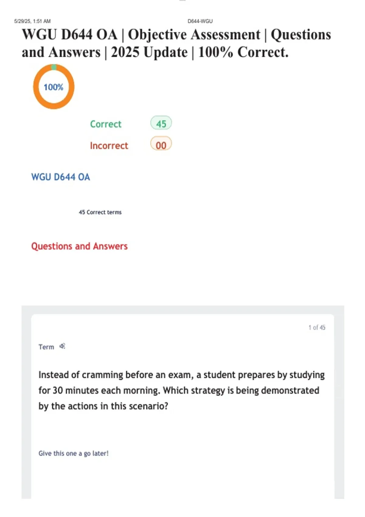 Preparing for the WGU D644 Objective Assessment (OA)? This resource provides practice questions and answers designed to help WGU students review key concepts, test their understanding, and build confidence before sitting the assessment. The questions are structured to reflect the format, difficulty, and topic coverage commonly assessed in D644, making this a practical revision tool for learners who prefer active, exam-style practice rather than passive reading. What This Resource Includes: WGU D644–aligned practice questions Clear answers for self-assessment and revision Coverage of core D644 learning objectives Ideal for final review before scheduling the OA Best Used For: WGU students preparing for the D644 Objective Assessment Practice-based revision and knowledge checks Identifying weak areas before the exam Last-minute exam preparation and confidence building This document is an independently created study aid intended to supplement official WGU course materials. It is designed for revision and practice purposes only.