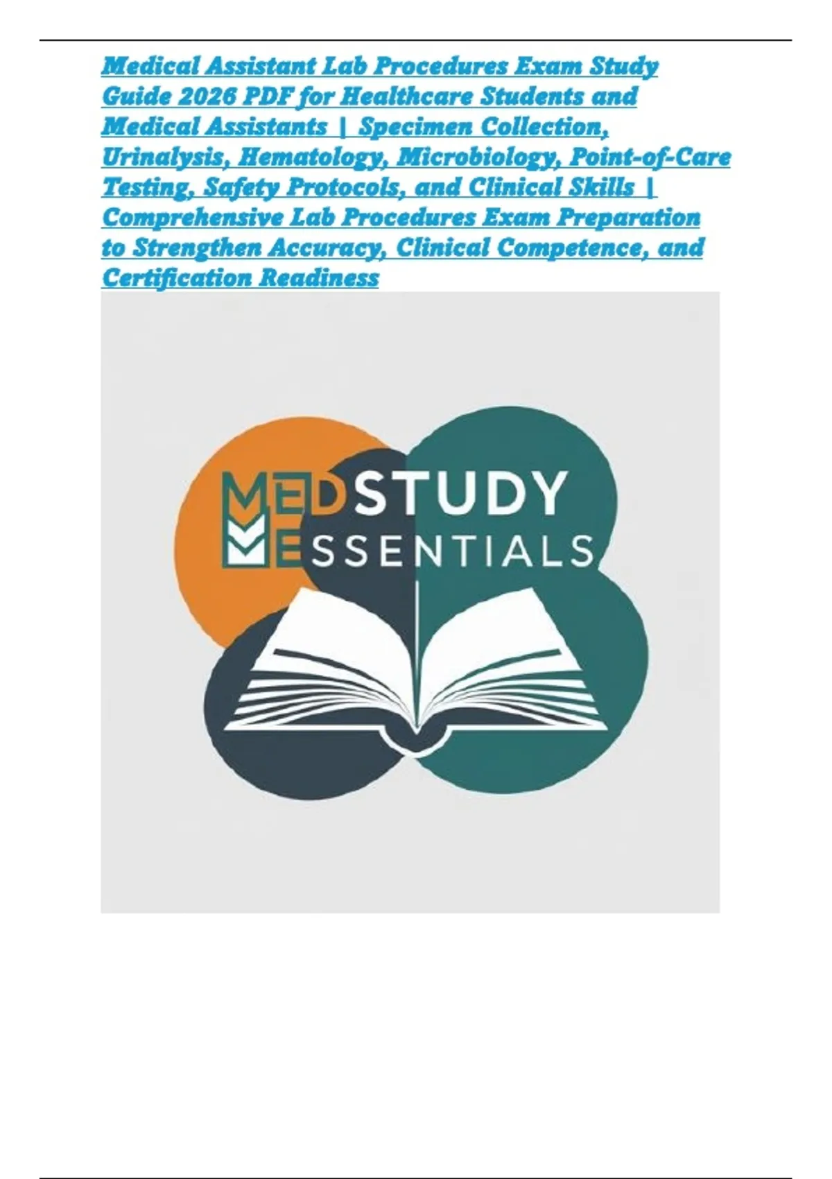 Prepare confidently for the 2026 Medical Assistant Lab Procedures Exam with this comprehensive study guide designed for healthcare students and medical assistants. This resource covers specimen collection, urinalysis, hematology, microbiology, point-of-care testing, laboratory safety protocols, and essential clinical skills. Structured to strengthen accuracy, procedural competency, and safe clinical practice, it helps learners confidently apply knowledge in both classroom and real-world lab settings. Ideal for students preparing for medical assistant certification or competency exams, this all-in-one lab procedures exam prep PDF enhances retention, builds confidence, and ensures readiness for both theoretical and practical evaluations.