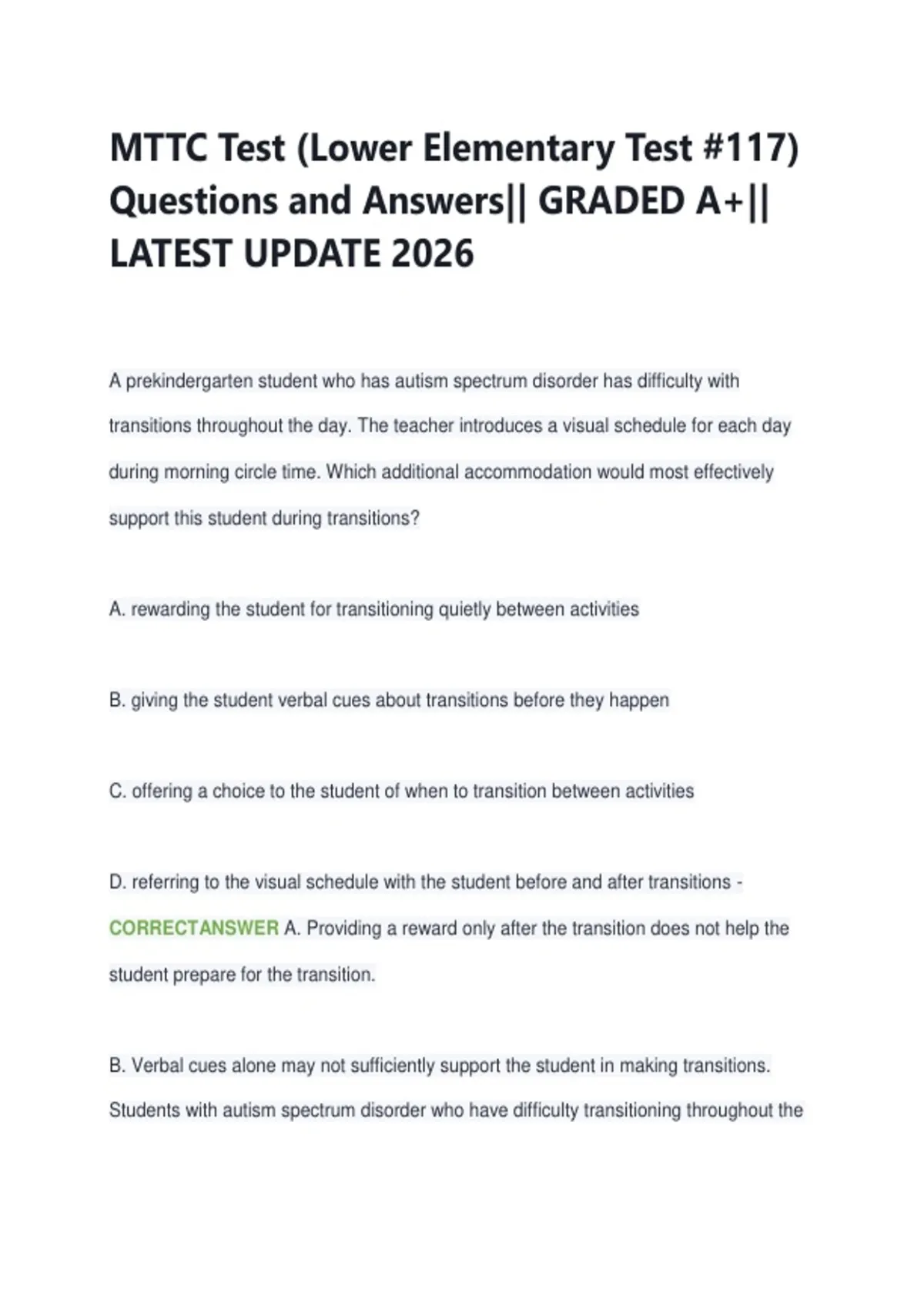 MTTC Test (Lower Elementary Test #117) Questions and Answers|| GRADED A+|| LATEST UPDATE 2026