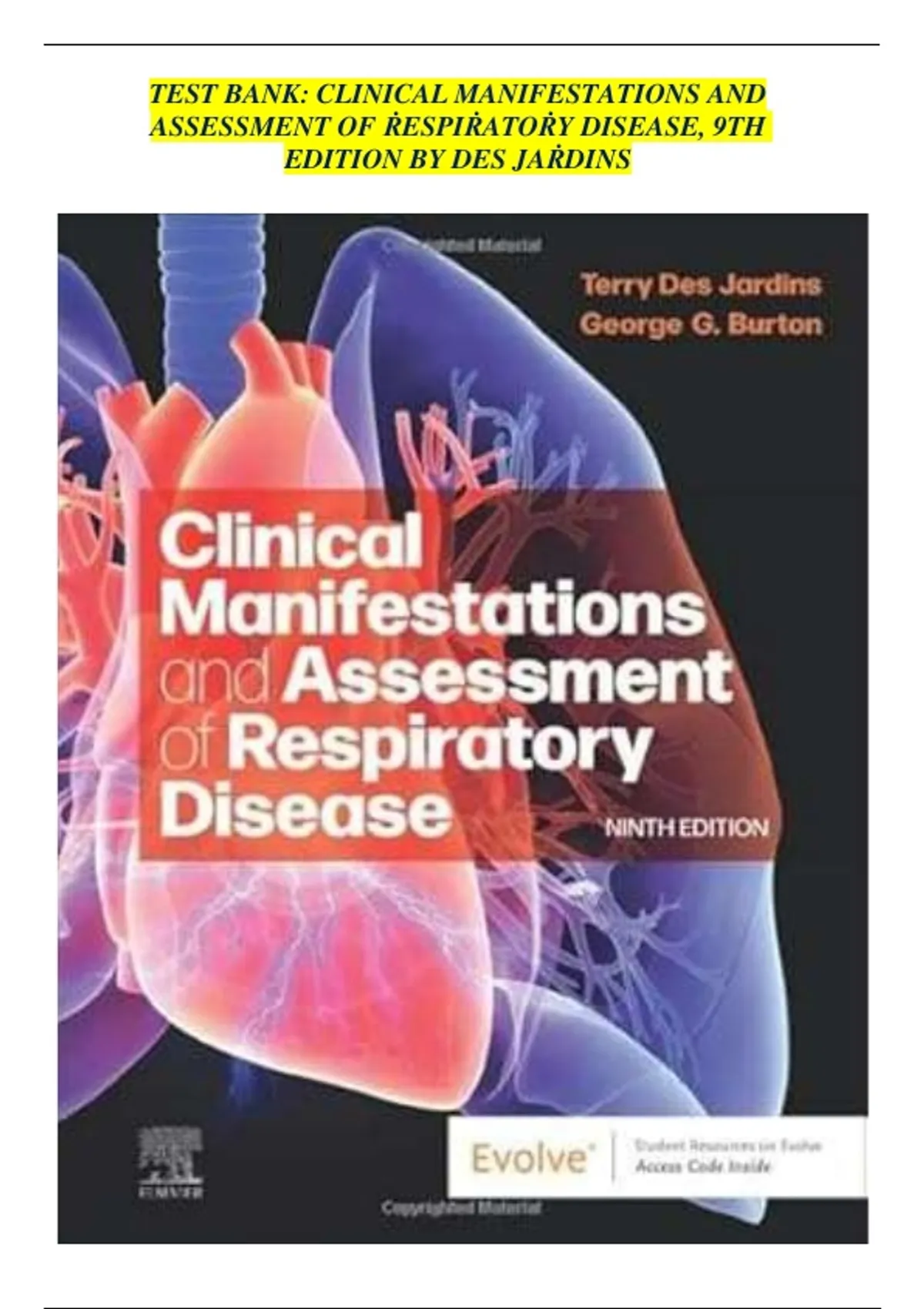 This comprehensive 2026 "Full Test Bank" provides exhaustive, chapter-by-chapter coverage for the 9th edition of Des Jardins’ Clinical Manifestations and Assessment of Respiratory Disease. This resource is essential for respiratory therapists and nurses specializing in pulmonary care, focusing on the ability to collect subjective and objective data to formulate accurate clinical assessments. It covers everything from basic bedside interviews to the management of complex conditions like ARDS and cyanide poisoning. Detailed multiple-choice questions explore the foundational skills of patient interaction. For example, it clarifies that the main purpose of the hospital client interview is to gather subjective data—the patient's feelings and perceptions regarding their condition. To ensure success, the practitioner must be an active listener, avoiding leading questions or overly complex medical terminology that might hinder communication. Furthermore, the resource provides verified protocols for emergency fluid resuscitation and toxicology. It emphasizes the Parkland Formula for burn management, recommending a volume of 4 mL/kg of body weight for each percent of body surface area burned to be infused over a 24-hour period. In cases of cyanide poisoning, the bank identifies Amyl nitrate as a recommended treatment. The bank also provides critical diagnostic insights for advanced respiratory failure. It notes that at certain carboxyhemoglobin levels, as well as in cases of pulmonary edema, signs of ARDS (Acute Respiratory Distress Syndrome) may become visible on a chest radiograph. Derived directly from the latest Elsevier curriculum updates, this resource is optimized for mastering arterial blood gas interpretation, breath sound analysis, and the clinical manifestations of obstructive and restrictive lung diseases. Terry Des Jardins Respiratory Disease 9th Edition, Respiratory Assessment Test Bank, Subjective Data in Patient Interview, Parkland Formula Calculation, Amyl Nitrate for Cyanide Poisoning, ARDS Clinical Manifestations, Carboxyhemoglobin Levels, Active Listening in Healthcare, Elsevier Respiratory Resources, CRT/RRT Exam Prep 2026.