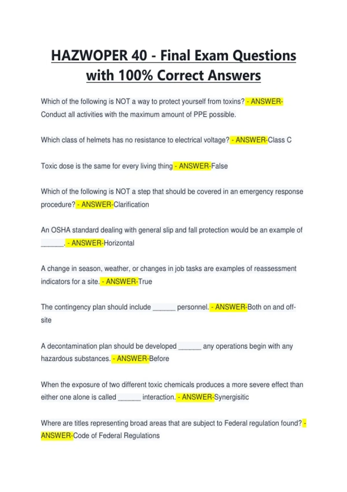 HAZWOPER 40 - Final Exam Questions with 100- Correct Answers