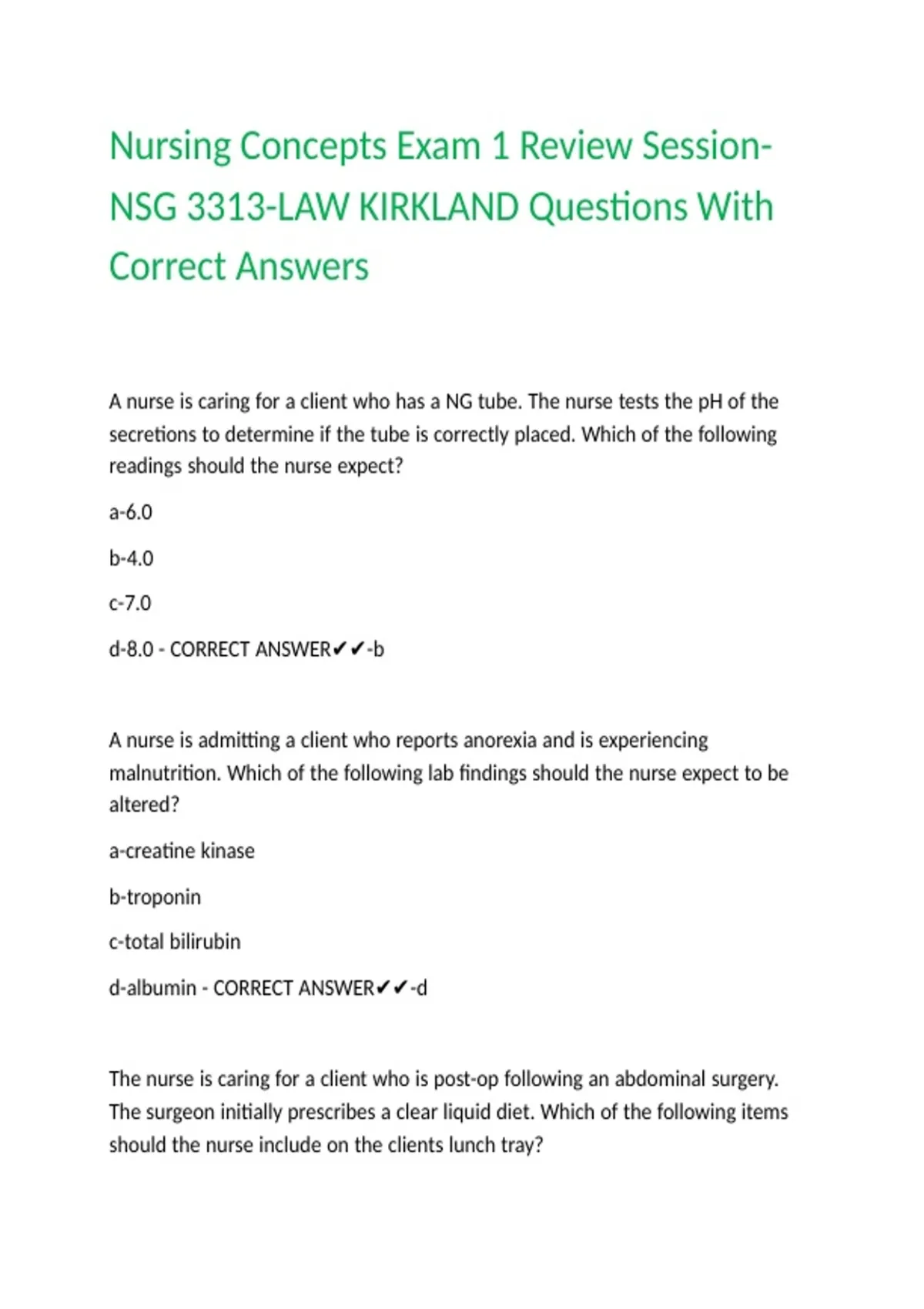 Nursing Concepts Exam 1 Review Session-NSG 3313-LAW KIRKLAND Questions With Correct Answers