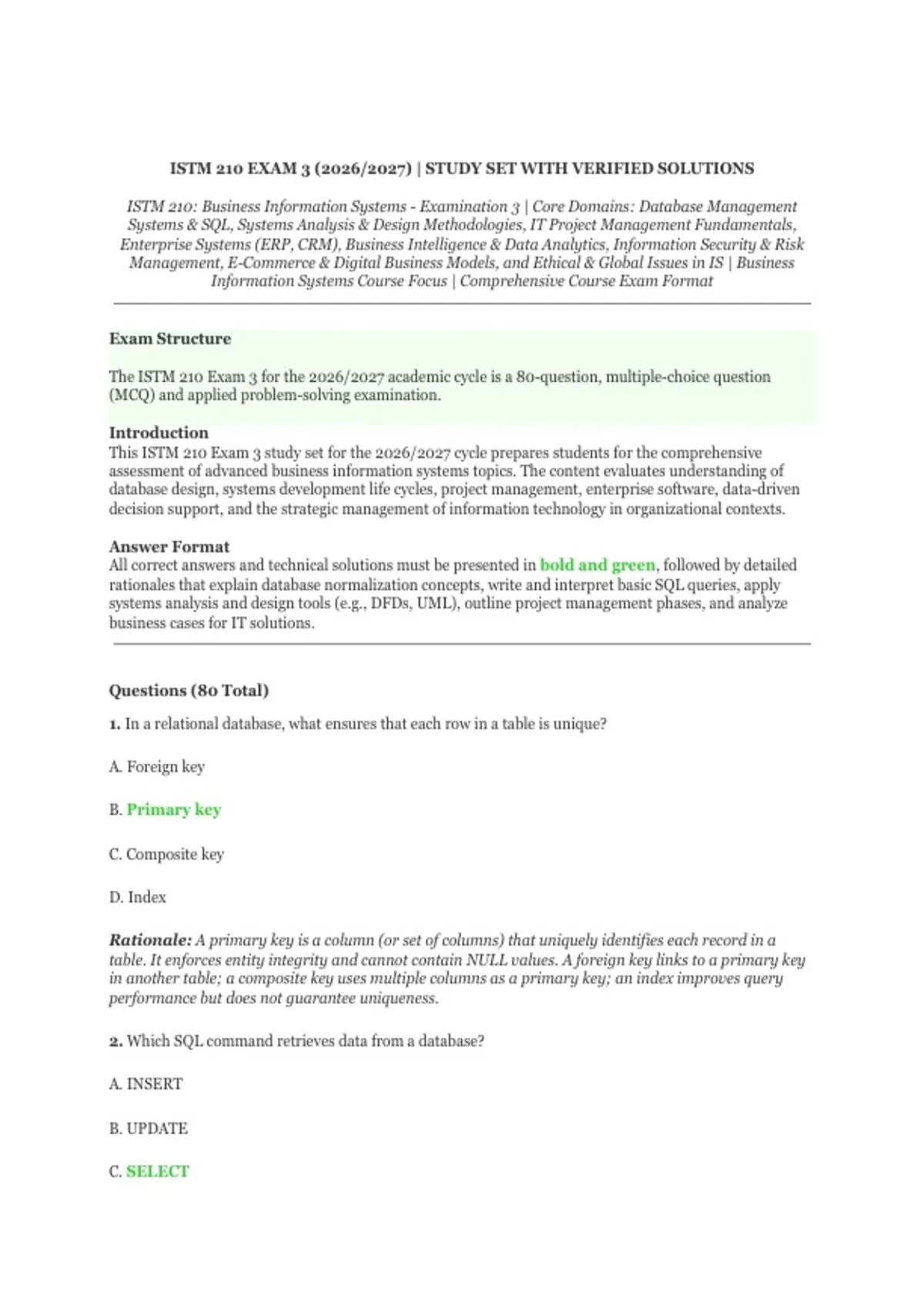The ISTM 210 Exam 3 for the 2026/2027 academic cycle is a 80-question, multiple-choice question