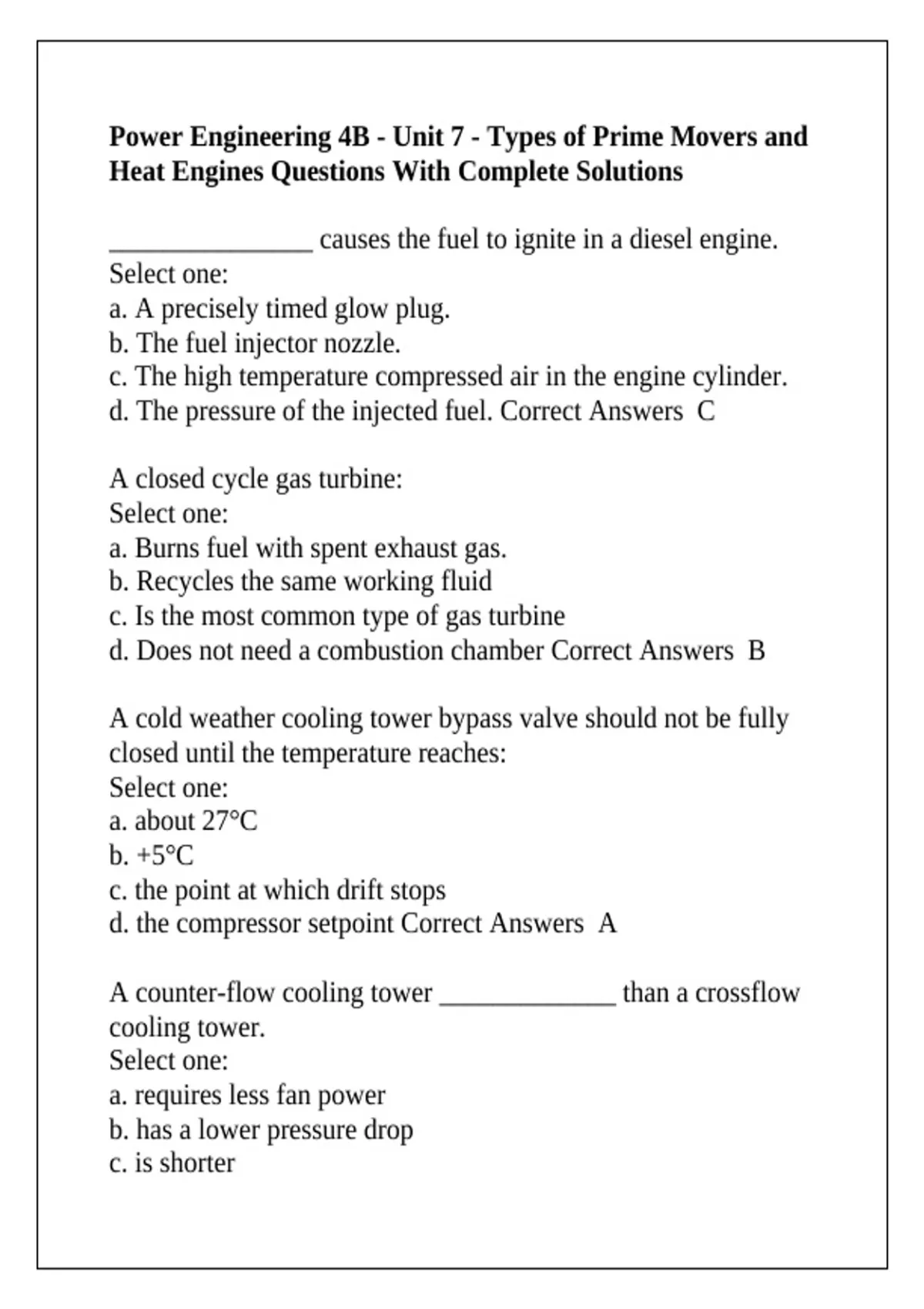 Power Engineering 4B - Unit 7 - Types of Prime Movers and Heat Engines Questions With Complete Solutions