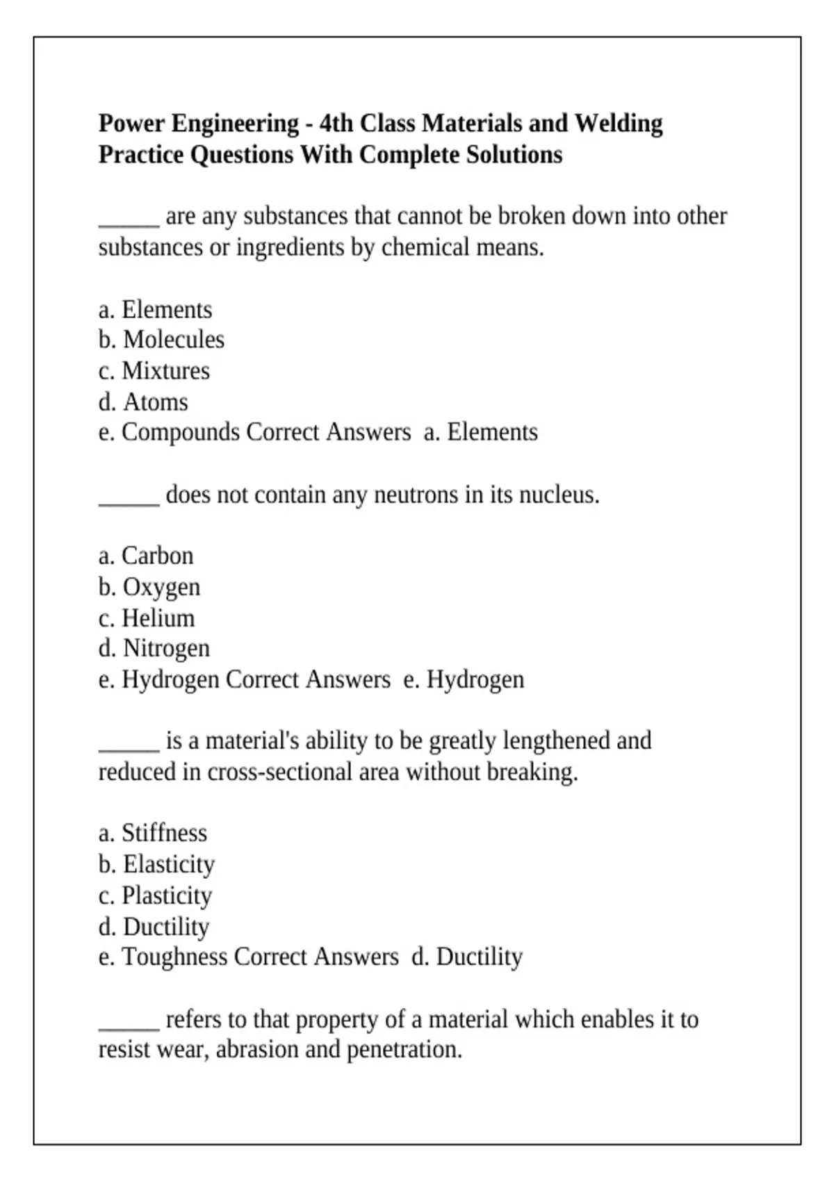 Power Engineering - 4th Class Materials and Welding Practice Questions With Complete Solutions