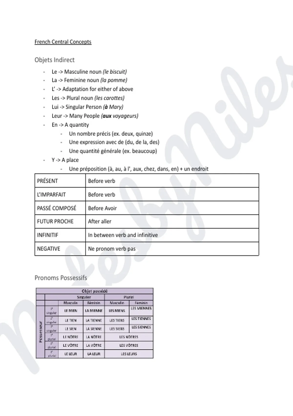 A comprehensive all-in-one French guide covering key concepts, grammar, and vocabulary—from Objets Indirects and Pronoms Possessifs to the Subjonctif Présent and common irregular verbs. Perfect for beginners and advanced learners alike, with clear examples, conjugations, and usage tips to boost both writing and speaking skills.