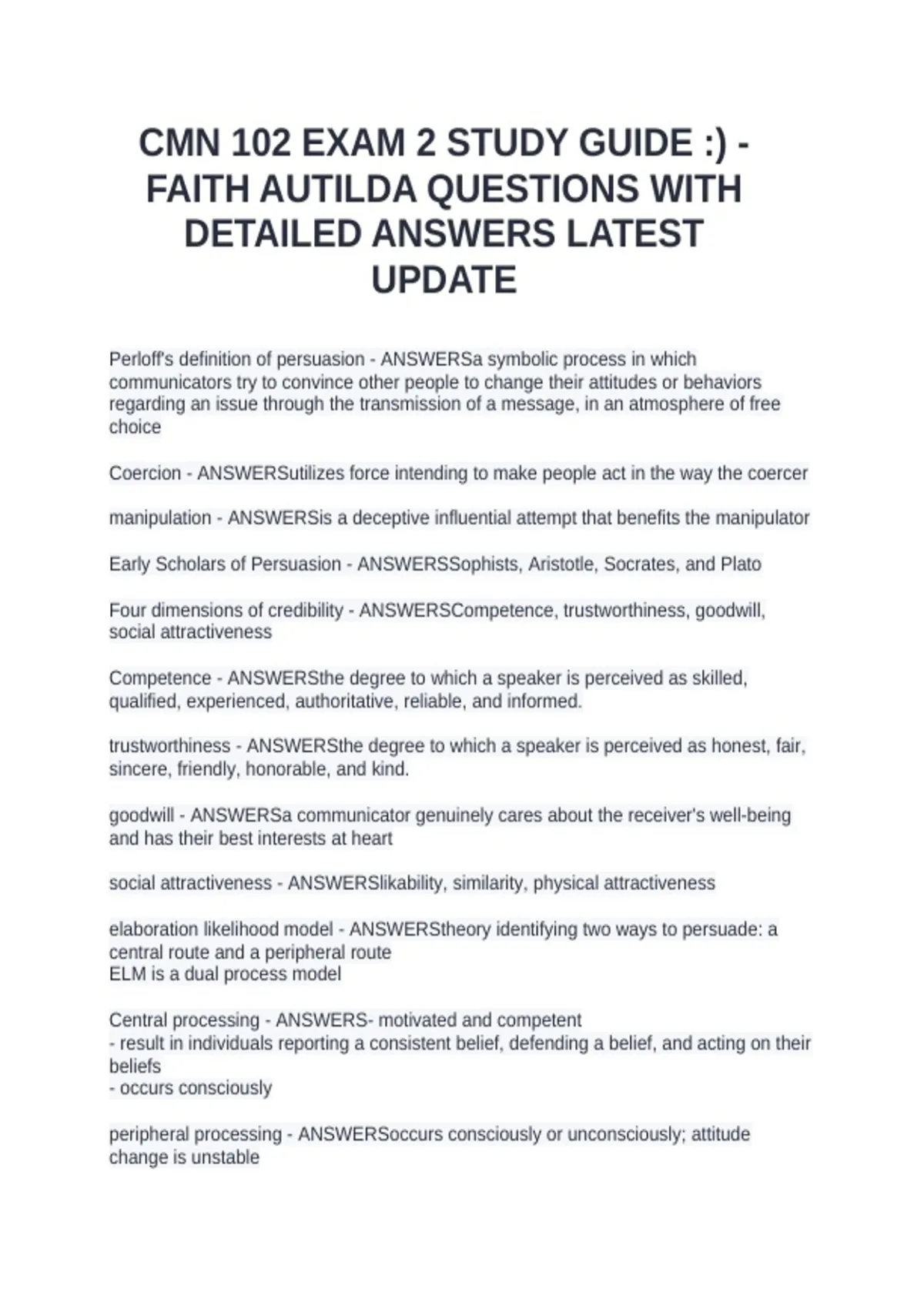 CMN 102 EXAM 2 STUDY GUIDE :) - FAITH AUTILDA QUESTIONS WITH DETAILED ANSWERS LATEST UPDATE