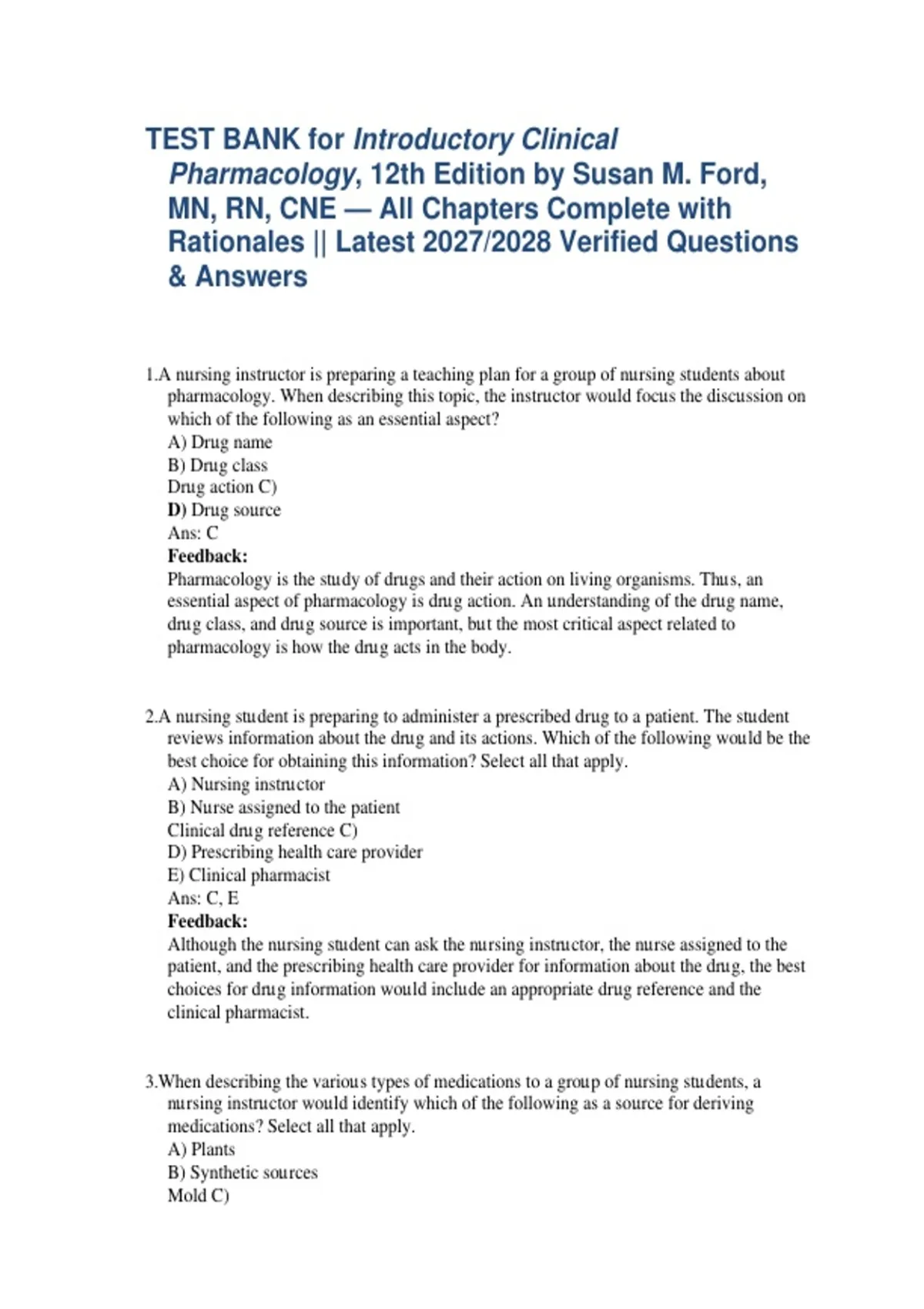 The Test Bank for Introductory Clinical Pharmacology, 12th Edition by Susan M. Ford, MN, RN, CNE — fully updated for 2027/2028 — provides a comprehensive, chapter‑by‑chapter collection of exam‑style questions with verified answers and detailed rationales aligned with the most recent edition of this foundational pharmacology textbook. The 12th Edition (published 2021) of Introductory Clinical Pharmacology delivers essential pharmacologic principles, safe medication management practices, and clinical judgment skills for nursing and allied health students. This test bank covers core topics such as basic drug action and pharmacokinetics, drug administration and safety, antimicrobial therapy, cardiovascular and endocrine agents, central nervous system drugs, and special populations. Designed for nursing coursework, classroom quizzes, and NCLEX®‑style review, this resource strengthens understanding, enhances clinical reasoning, and prepares students for success on exams and in practice.