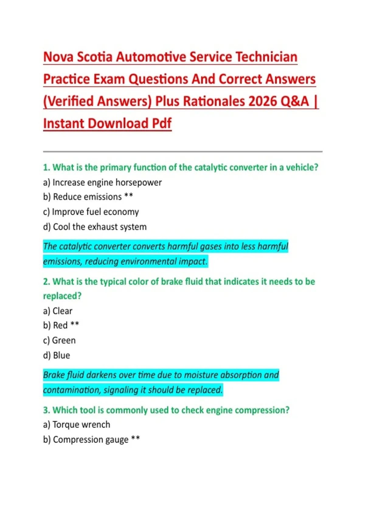 Nova Scotia Automotive Service Technician Practice Exam Questions And Correct Answers (Verified Answers) Plus Rationales 2026 Q&A | Instant Download Pdf
