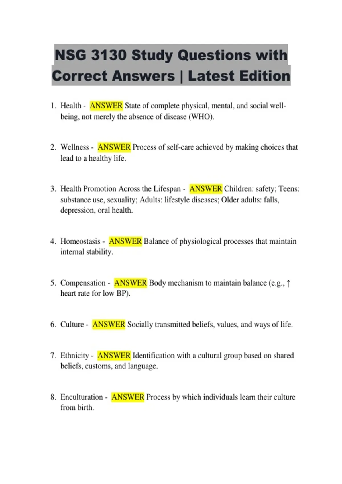 NSG 3130 Study Questions with Correct Answers | Latest Edition