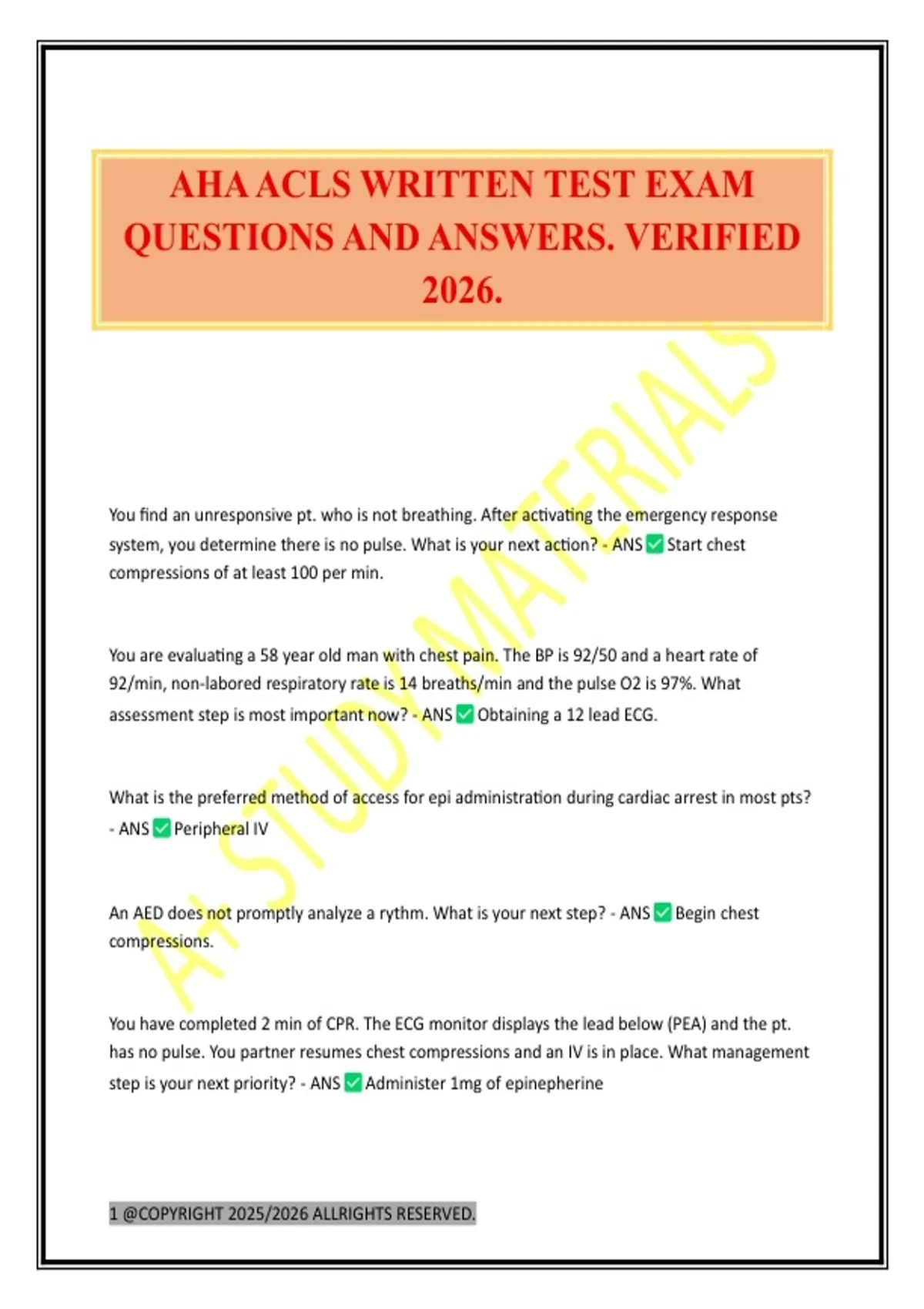 AHA ACLS WRITTEN TEST EXAM QUESTIONS AND ANSWERS. VERIFIED 2026.