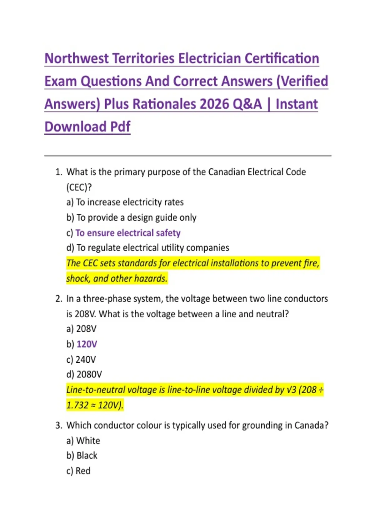 Northwest Territories Electrician Certification Exam Questions And Correct Answers (Verified Answers) Plus Rationales 2026 Q&A | Instant Download Pdf