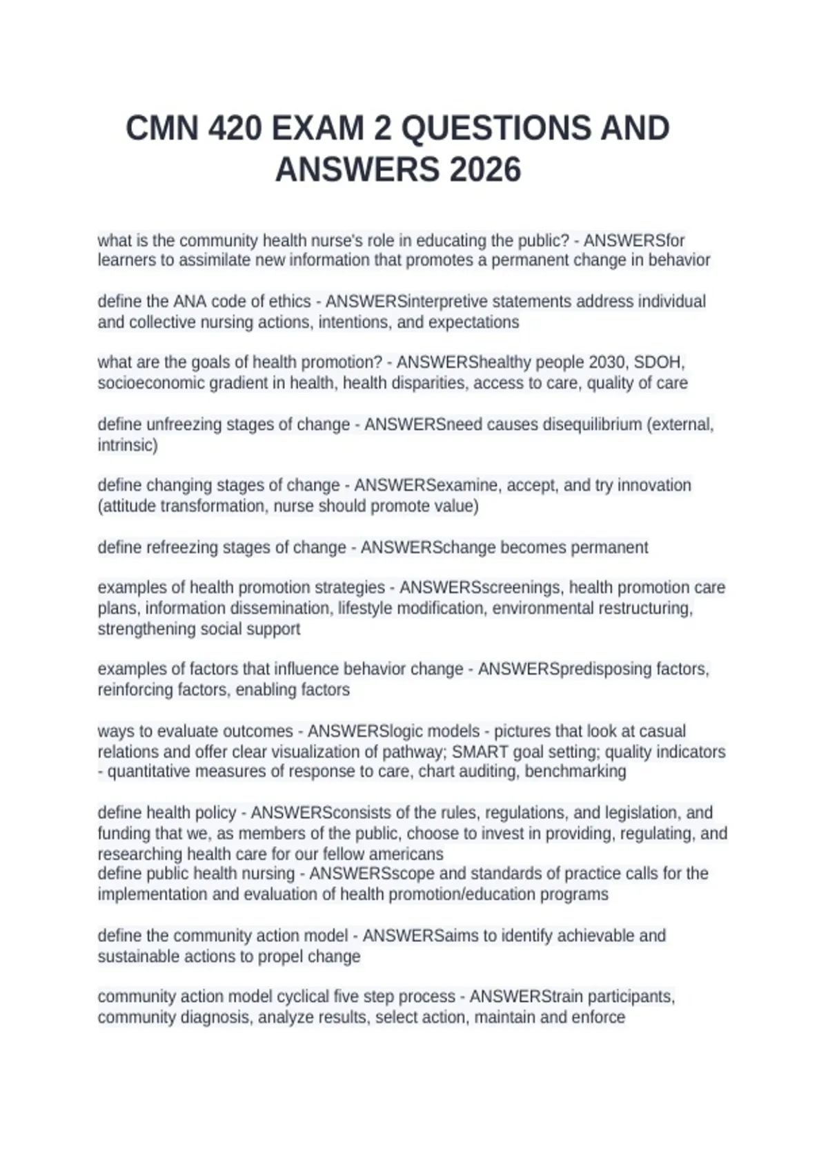 what is the community health nurse's role in educating the public? - ANSWERSfor learners to assimilate new information that promotes a permanent change in behavior define the ANA code of ethics - ANSWERSinterpretive statements address individual and collective nursing actions, intentions, and expectations what are the goals of health promotion? - ANSWERShealthy people 2030, SDOH, socioeconomic gradient in health, health disparities, access to care, quality of care define unfreezing stages of change - ANSWERSneed causes disequilibrium (external, intrinsic) define changing stages of change - ANSWERSexamine, accept, and try innovation (attitude transformation, nurse should promote value) define refreezing stages of change - ANSWERSchange becomes permanent examples of health promotion strategies - ANSWERSscreenings, health promotion care plans, information dissemination, lifestyle modification, environmental restructuring, strengthening social support examples of factors that influence behavior change - ANSWERSpredisposing factors, reinforcing factors, enabling factors ways to evaluate outcomes - ANSWERSlogic models - pictures that look at casual relations and offer clear visualization of pathway; SMART goal setting; quality indicators - quantitative measures of response to care, chart auditing, benchmarking define health policy - ANSWERSconsists of the rules, regulations, and legislation, and funding that we, as members of the public, choose to invest in providing, regulating, and researching health care for our fellow americans define public health nursing - ANSWERSscope and standards of practice calls for the