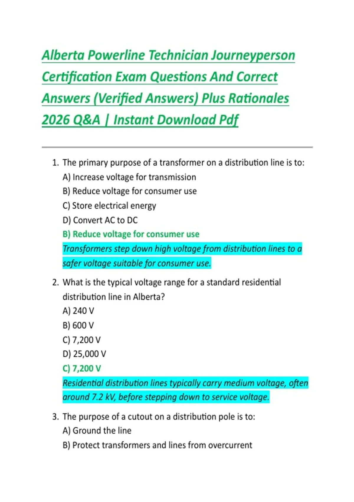 Alberta Powerline Technician Journeyperson Certification Exam Questions And Correct Answers (Verified Answers) Plus Rationales 2026 Q&A | Instant Download Pdf