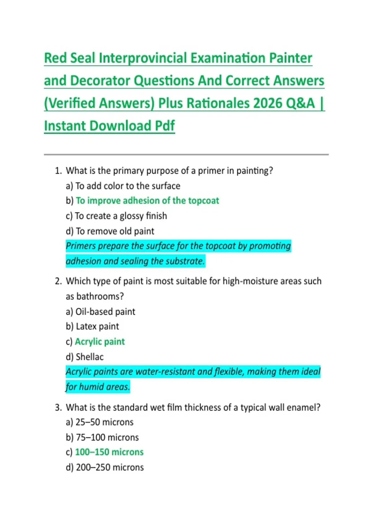 Red Seal Interprovincial Examination Painter and Decorator Questions And Correct Answers (Verified Answers) Plus Rationales 2026 Q&A | Instant Download Pdf