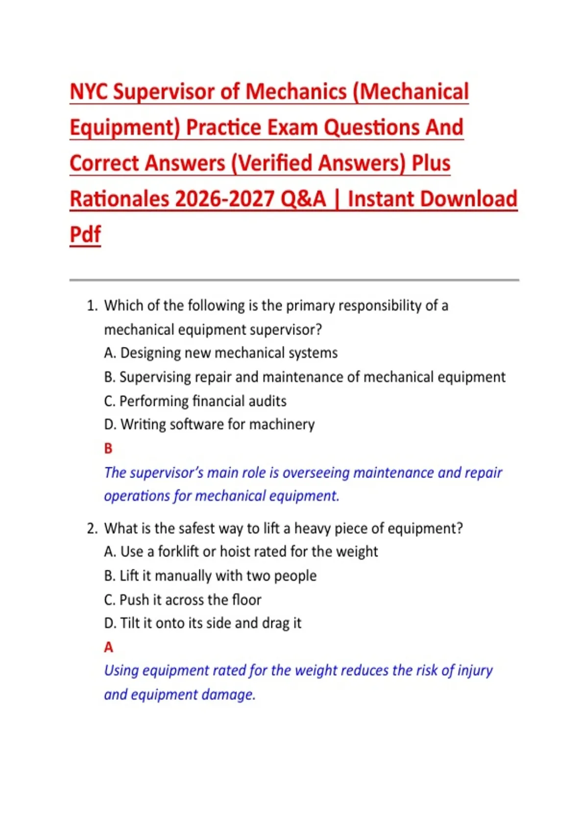NYC Supervisor of Mechanics (Mechanical Equipment) Practice Exam Questions And Correct Answers (Verified Answers) Plus Rationales Q&A | Instant Download Pdf