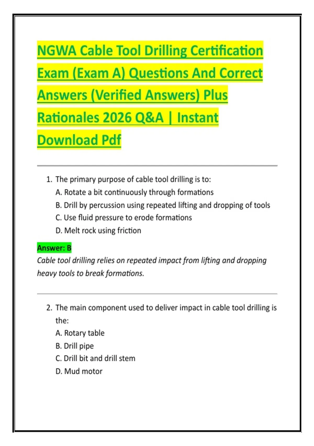 Bundle for NGWA Cable Tool Drilling Certification Exam (Exam A) and (Exam B) Questions And Correct Answers (Verified Answers) Plus Rationales 2026 Q&A | Instant Download Pdf