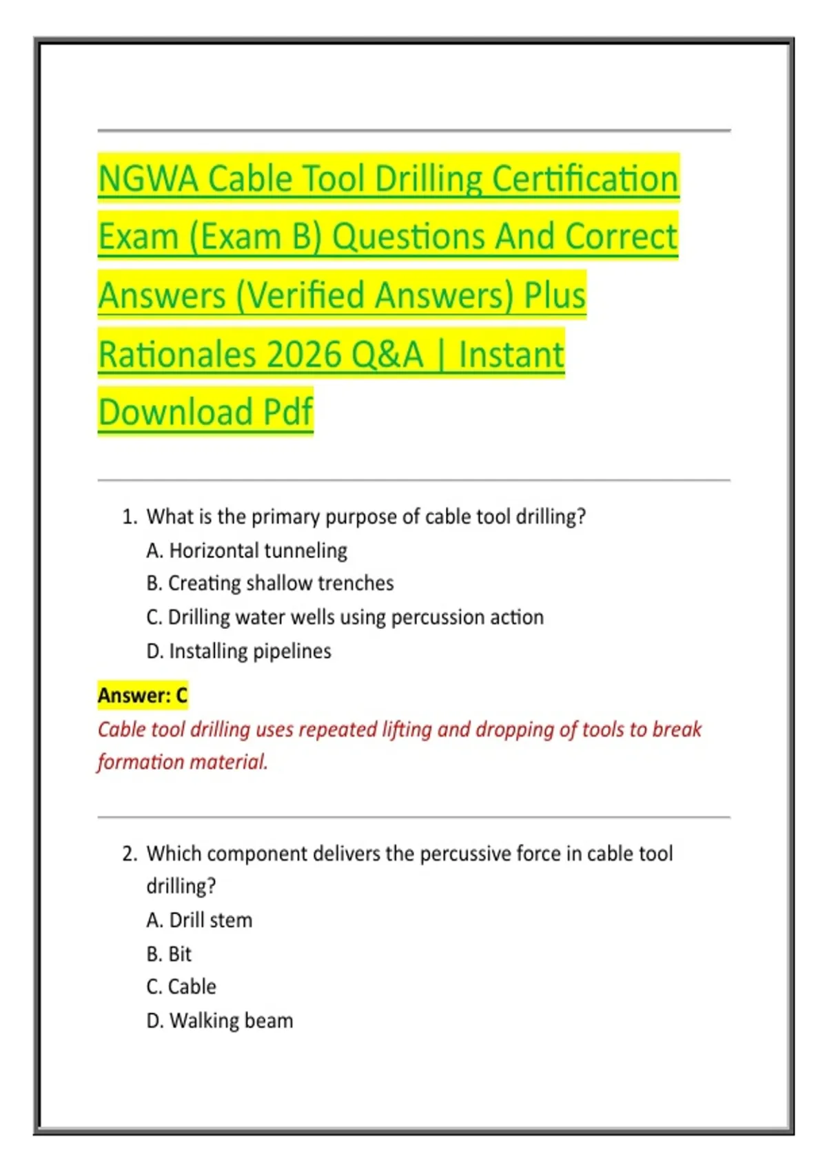 NGWA Cable Tool Drilling Certification Exam (Exam B) Questions And Correct Answers (Verified Answers) Plus Rationales 2026 Q&A | Instant Download Pdf