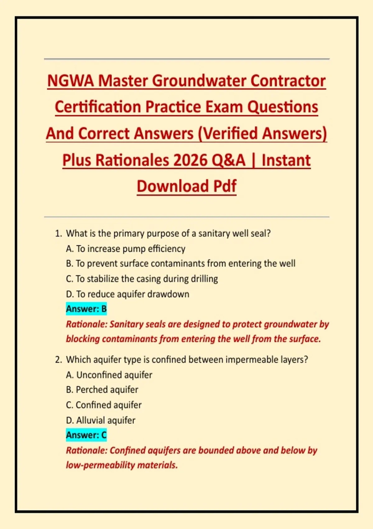 NGWA Master Groundwater Contractor Certification Practice Exam Questions And Correct Answers (Verified Answers) Plus Rationales 2026 Q&A | Instant Download Pdf