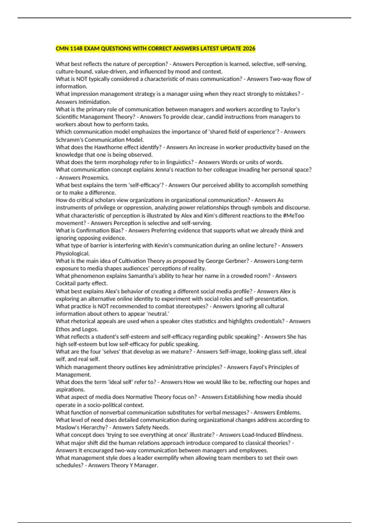 CMN 1148 EXAM QUESTIONS WITH CORRECT ANSWERS LATEST UPDATE 2026 What best reflects the nature of perception? - Answers Perception is learned, selective, self-serving, culture-bound, value-driven, and influenced by mood and context. What is NOT typically considered a characteristic of mass communication? - Answers Two-way flow of information. What impression management strategy is a manager using when they react strongly to mistakes? - Answers Intimidation. What is the primary role of communication between managers and workers according to Taylor's Scientific Management Theory? - Answers To provide clear, candid instructions from managers to workers about how to perform tasks. Which communication model emphasizes the importance of 'shared field of experience'? - Answers Schramm's Communication Model. What does the Hawthorne effect identify? - Answers An increase in worker productivity based on the knowledge that one is being observed. What does the term morphology refer to in linguistics? - Answers Words or units of words. What communication concept explains Jenna's reaction to her colleague invading her personal space? - Answers Proxemics. What best explains the term 'self-efficacy'? - Answers Our perceived ability to accomplish something or to make a difference. How do critical scholars view organizations in organizational communication? - Answers As instruments of privilege or oppression, analyzing power relationships through symbols and discourse. What characteristic of perception is illustrated by Alex and Kim's different reactions to the #MeToo movement? - Answers Perception is selective and self-serving. What is Confirmation Bias? - Answers Preferring evidence that supports what we already think and ignoring opposing evidence. What type of barrier is interfering with Kevin's communication during an online lecture? - Answers Physiological. What is the main idea of Cultivation Theory as proposed by George Gerbner? - Answers Long-term exposure to media shapes audiences' perceptions of reality. What phenomenon explains Samantha's ability to hear her name in a crowded room? - Answers Cocktail party effect. What best explains Alex's behavior of creating a different social media profile? - Answers Alex is exploring an alternative online identity to experiment with social roles and self-presentation. What practice is NOT recommended to combat stereotypes? - Answers Ignoring all cultural information about others to appear 'neutral.' What rhetorical appeals are used when a speaker cites statistics and highlights credentials? - Answers Ethos and Logos. What reflects a student's self-esteem and self-efficacy regarding public speaking? - Answers She has high self-esteem but low self-efficacy for public speaking. What are the four 'selves' that develop as we mature? - Answers Self-image, looking-glass self, ideal self, and real self. Which management theory outlines key administrative principles? - Answers Fayol's Principles of Management. What does the term 'ideal self' refer to? - Answers How we would like to be, reflecting our hopes and aspirations. What aspect of media does Normative Theory focus on? - Answers Establishing how media should operate in a socio-political context. What function of nonverbal communication substitutes for verbal messages? - Answers Emblems. What level of need does detailed communication during organizational changes address according to Maslow's Hierarchy? - Answers Safety Needs. What concept does 'trying to see everything at once' illustrate? - Answers Load-Induced Blindness. What major shift did the human relations approach introduce compared to classical theories? - Answers It encouraged two-way communication between managers and employees. What management style does a leader exemplify when allowing team members to set their own schedules? - Answers Theory Y Manager. What is Valleyspeak? - Answers A variety of English characterized by uptalking and excessive use of the word 'like.' Which communication model is defined as a dynamic, ongoing process that expands over time? - Answers Dance's (1967) Helical Communication Model What is a nonverbal cue indicating a desire to speak? - Answers Regulator Language that distorts or obscures the true meaning of an idea is known as what? - Answers Doublespeak What is the best example of paralanguage? - Answers Speaking in a high-pitched, fast tone when excited What refers to the tendency to attribute successes to internal factors and failures to external factors? - Answers Self-Serving Bias What is empathic listening? - Answers Listening from the perspective of the other person, focusing on their feelings and viewpoint.