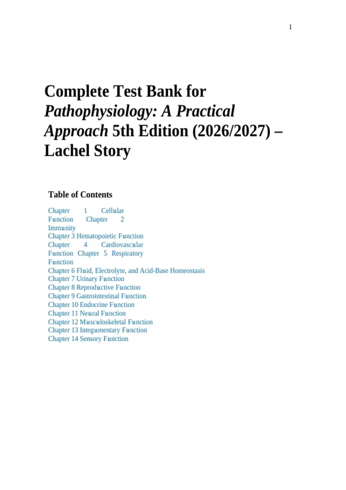 The Complete Test Bank for Pathophysiology: A Practical Approach, 5th Edition (2026/2027) by Lachel Story provides a comprehensive set of chapter-by-chapter exam questions with verified answers and detailed explanations designed for nursing and health sciences education. Aligned with the latest 5th Edition curriculum, this test bank covers foundational pathophysiology topics including cellular function, immune responses, cardiovascular, respiratory, renal, endocrine, gastrointestinal, and neurological pathologies, as well as clinical application and NCLEX-style questions. Updated to support current educational standards, this resource enhances understanding, promotes critical thinking, and prepares students for academic exams and licensure review.