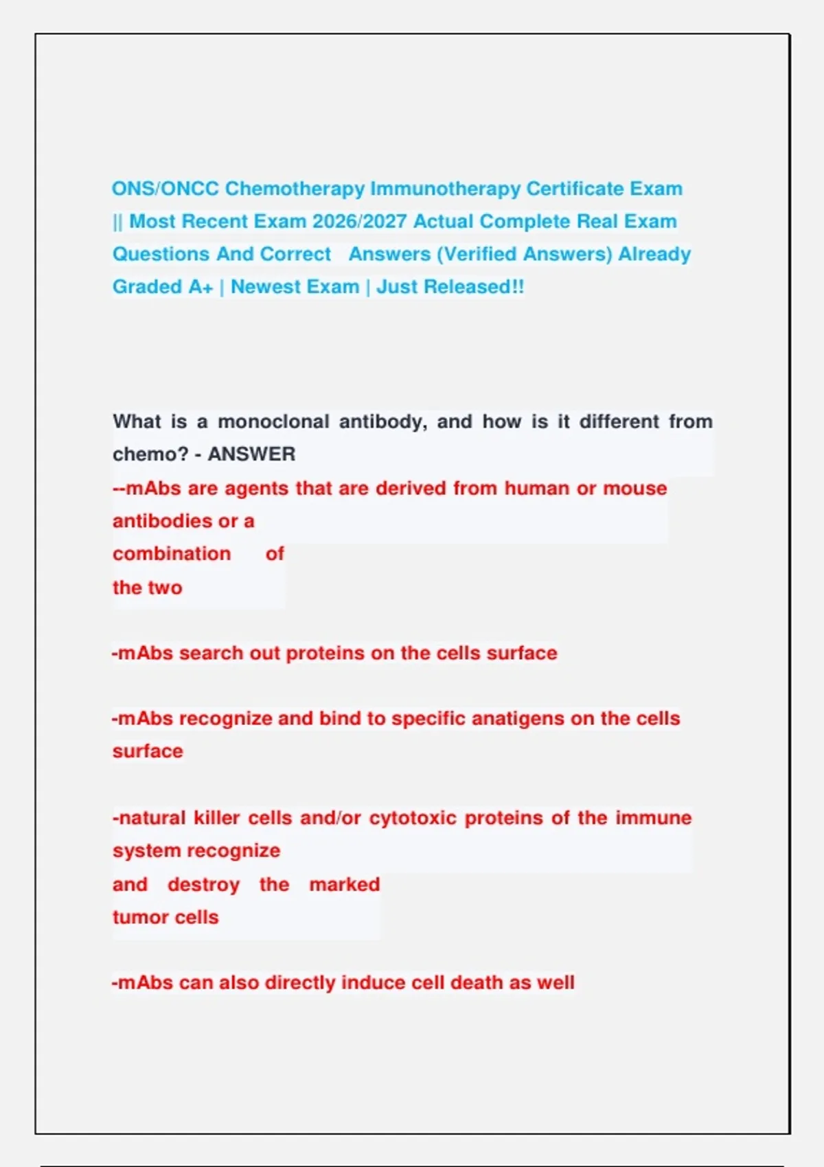 ONS/ONCC Chemotherapy Immunotherapy Certificate Exam || Most Recent Exam 2026/2027 Actual Complete Real Exam Questions And Correct Answers (Verified Answers) Already Graded A+ | Newest Exam | Just Released!! ONS/ONCC Chemotherapy Immunotherapy Certificate Exam || Most Recent Exam 2026/2027 Actual Complete Real Exam Questions And Correct Answers (Verified Answers) Already Graded A+ | Newest Exam | Just Released!! ONS/ONCC Chemotherapy Immunotherapy Certificate Exam || Most Recent Exam 2026/2027 Actual Complete Real Exam Questions And Correct Answers (Verified Answers) Already Graded A+ | Newest Exam | Just Released!! ONS/ONCC Chemotherapy Immunotherapy Certificate Exam || Most Recent Exam 2026/2027 Actual Complete Real Exam Questions And Correct Answers (Verified Answers) Already Graded A+ | Newest Exam | Just Released!! ONS/ONCC Chemotherapy Immunotherapy Certificate Exam || Most Recent Exam 2026/2027 Actual Complete Real Exam Questions And Correct Answers (Verified Answers) Already Graded A+ | Newest Exam | Just Released!! ONS/ONCC Chemotherapy Immunotherapy Certificate Exam || Most Recent Exam 2026/2027 Actual Complete Real Exam Questions And Correct Answers (Verified Answers) Already Graded A+ | Newest Exam | Just Released!!