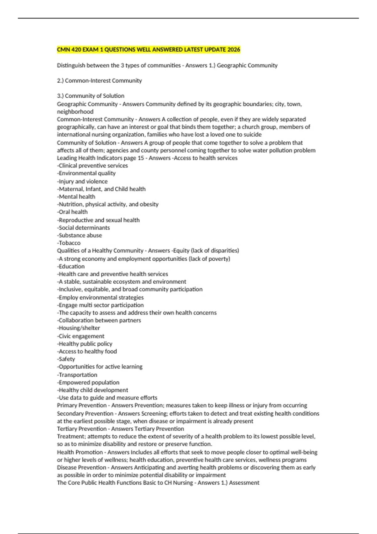 CMN 420 EXAM 1 QUESTIONS WELL ANSWERED LATEST UPDATE 2026 Distinguish between the 3 types of communities - Answers 1.) Geographic Community 2.) Common-Interest Community 3.) Community of Solution Geographic Community - Answers Community defined by its geographic boundaries; city, town, neighborhood Common-Interest Community - Answers A collection of people, even if they are widely separated geographically, can have an interest or goal that binds them together; a church group, members of international nursing organization, families who have lost a loved one to suicide Community of Solution - Answers A group of people that come together to solve a problem that affects all of them; agencies and county personnel coming together to solve water pollution problem Leading Health Indicators page 15 - Answers -Access to health services -Clinical preventive services -Environmental quality -Injury and violence -Maternal, Infant, and Child health -Mental health -Nutrition, physical activity, and obesity -Oral health -Reproductive and sexual health -Social determinants -Substance abuse -Tobacco Qualities of a Healthy Community - Answers -Equity (lack of disparities) -A strong economy and employment opportunities (lack of poverty) -Education -Health care and preventive health services -A stable, sustainable ecosystem and environment -Inclusive, equitable, and broad community participation -Employ environmental strategies -Engage multi sector participation -The capacity to assess and address their own health concerns -Collaboration between partners -Housing/shelter -Civic engagement -Healthy public policy -Access to healthy food -Safety -Opportunities for active learning -Transportation -Empowered population -Healthy child development -Use data to guide and measure efforts Primary Prevention - Answers Prevention; measures taken to keep illness or injury from occurring Secondary Prevention - Answers Screening; efforts taken to detect and treat existing health conditions at the earliest possible stage, when disease or impairment is already present Tertiary Prevention - Answers Tertiary Prevention Treatment; attempts to reduce the extent of severity of a health problem to its lowest possible level, so as to minimize disability and restore or preserve function. Health Promotion - Answers Includes all efforts that seek to move people closer to optimal well-being or higher levels of wellness; health education, preventive health care services, wellness programs Disease Prevention - Answers Anticipating and averting health problems or discovering them as early as possible in order to minimize potential disability or impairment The Core Public Health Functions Basic to CH Nursing - Answers 1.) Assessment 2.) Policy Development 3.) Assurance Assessment - Answers Gathering and analyzing info that will affect the health of people to be served Policy Development - Answers The synthesis and analysis of info gained during assessment Assurance - Answers Activities that make certain that services are provided Roles of the Community Health Nurse - Answers 1.) Clinician 2.) Educator 3.) Advocate 4.) Manager 5.) Collaborator 6.) Leadership 7.) Researcher