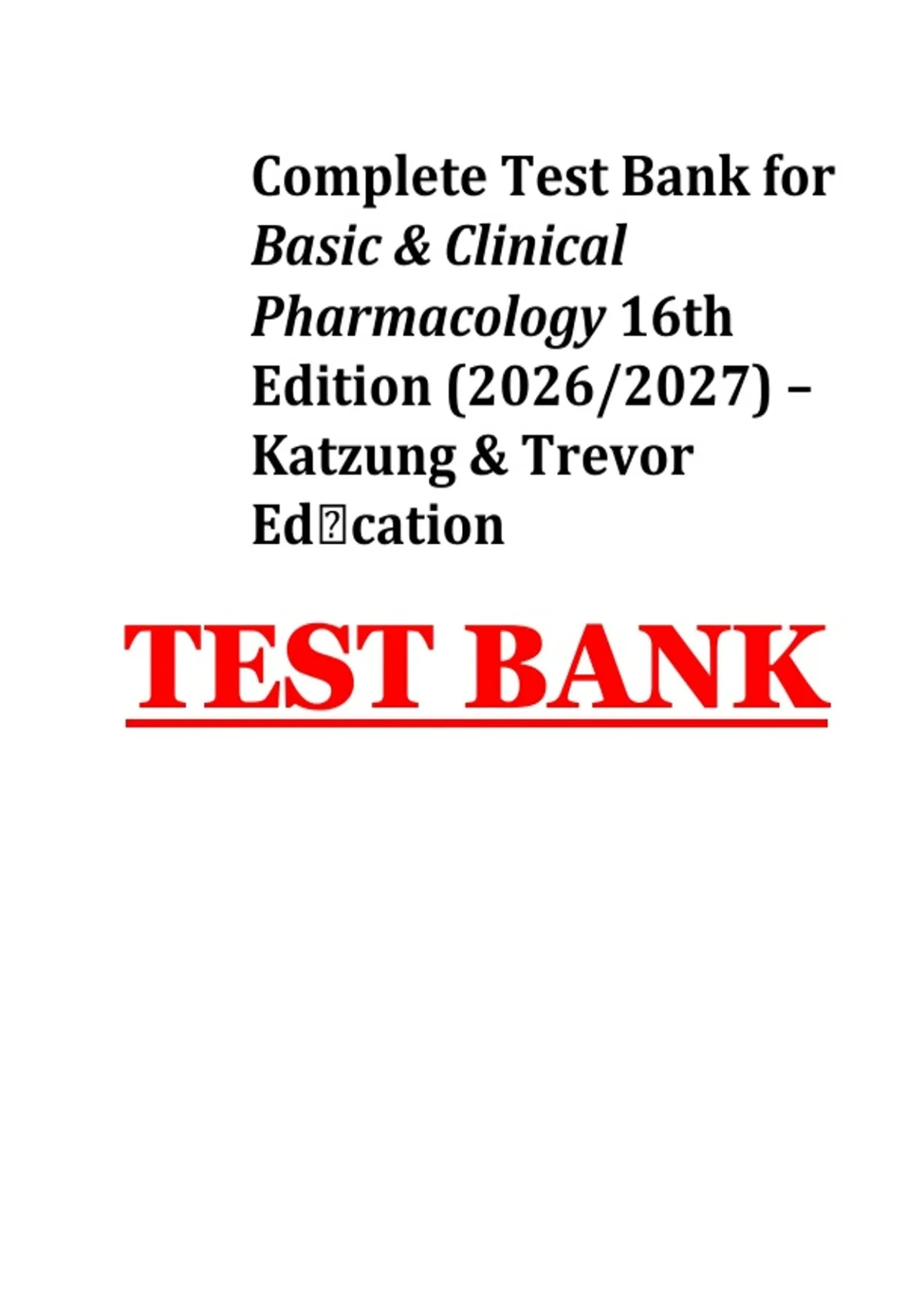 The Complete Test Bank for Basic & Clinical Pharmacology, 16th Edition (2026/2027) by Bertram G. Katzung and Anthony J. Trevor offers a comprehensive set of chapter‑by‑chapter exam questions with verified answers and detailed rationales matched to the most current 16th Edition curriculum. This test bank spans essential pharmacology topics — including pharmacokinetics, pharmacodynamics, major drug classes, clinical applications, mechanisms of action, adverse effects, and patient safety. Designed for nursing, pharmacy, medical, and health sciences students, it enhances understanding of drug therapy principles, reinforces clinical reasoning, and supports exam success including NCLEX®‑style and board review practice.