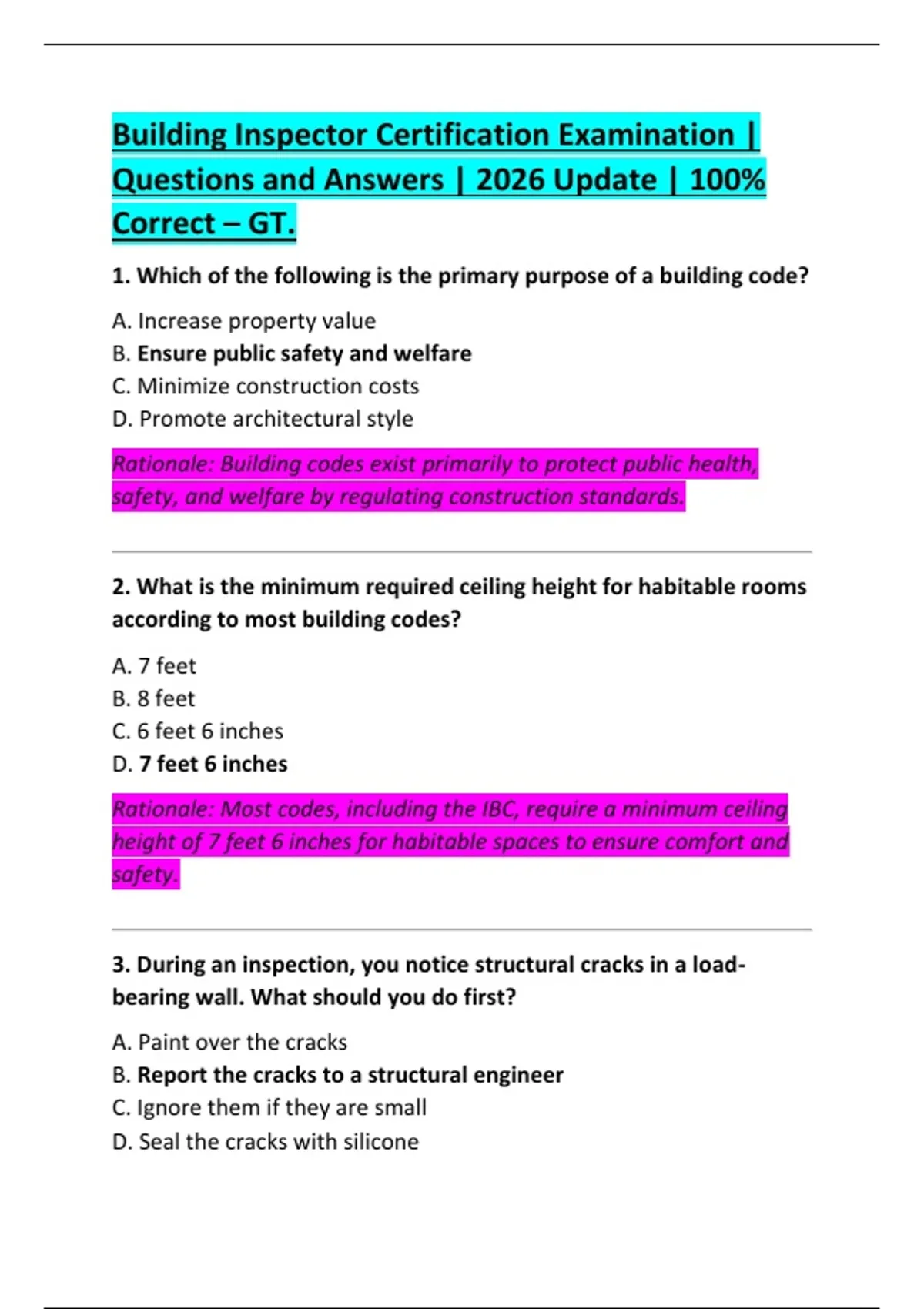 Building Inspector Certification Examination | Questions and Answers | 2026 Update | 100% Correct – GT.