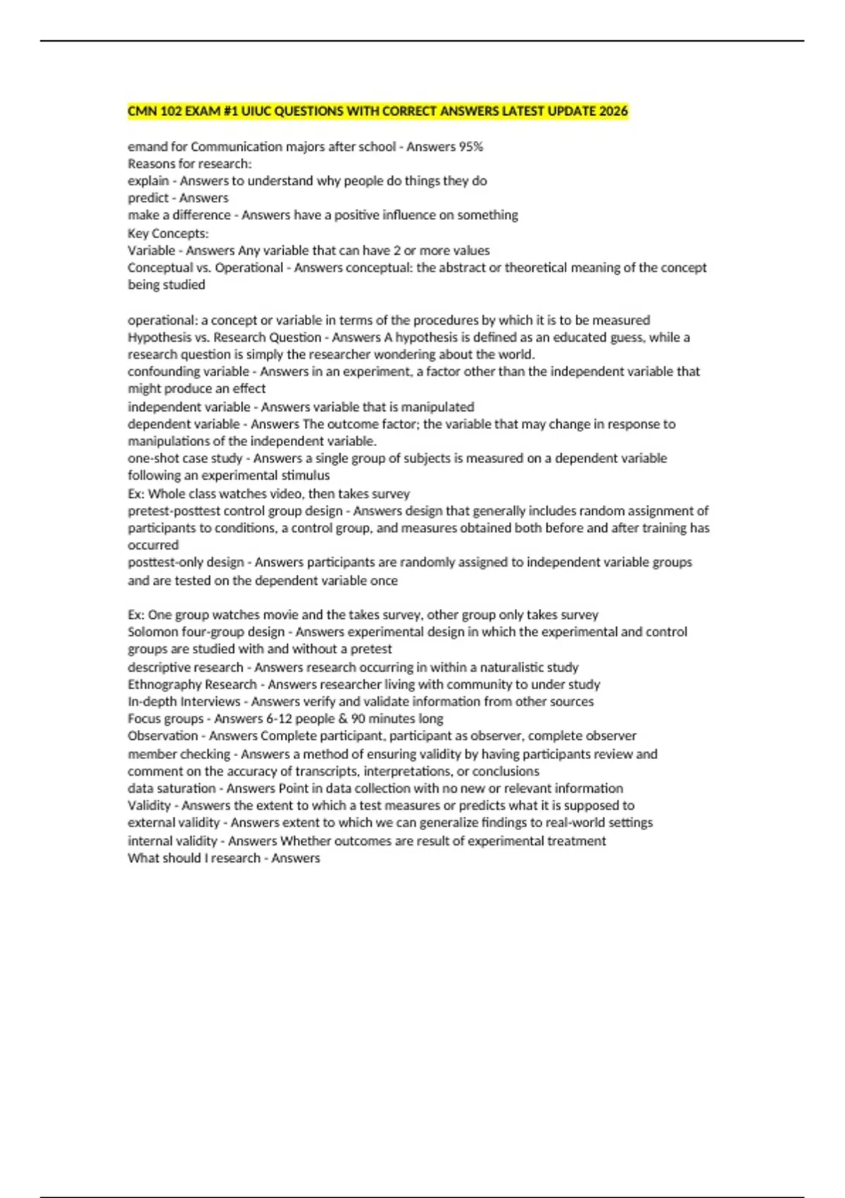 CMN 102 EXAM #1 UIUC QUESTIONS WITH CORRECT ANSWERS LATEST UPDATE 2026 emand for Communication majors after school - Answers 95% Reasons for research: explain - Answers to understand why people do things they do predict - Answers make a difference - Answers have a positive influence on something Key Concepts: Variable - Answers Any variable that can have 2 or more values Conceptual vs. Operational - Answers conceptual: the abstract or theoretical meaning of the concept being studied operational: a concept or variable in terms of the procedures by which it is to be measured Hypothesis vs. Research Question - Answers A hypothesis is defined as an educated guess, while a research question is simply the researcher wondering about the world. confounding variable - Answers in an experiment, a factor other than the independent variable that might produce an effect independent variable - Answers variable that is manipulated dependent variable - Answers The outcome factor; the variable that may change in response to manipulations of the independent variable. one-shot case study - Answers a single group of subjects is measured on a dependent variable following an experimental stimulus Ex: Whole class watches video, then takes survey pretest-posttest control group design - Answers design that generally includes random assignment of participants to conditions, a control group, and measures obtained both before and after training has occurred posttest-only design - Answers participants are randomly assigned to independent variable groups and are tested on the dependent variable once