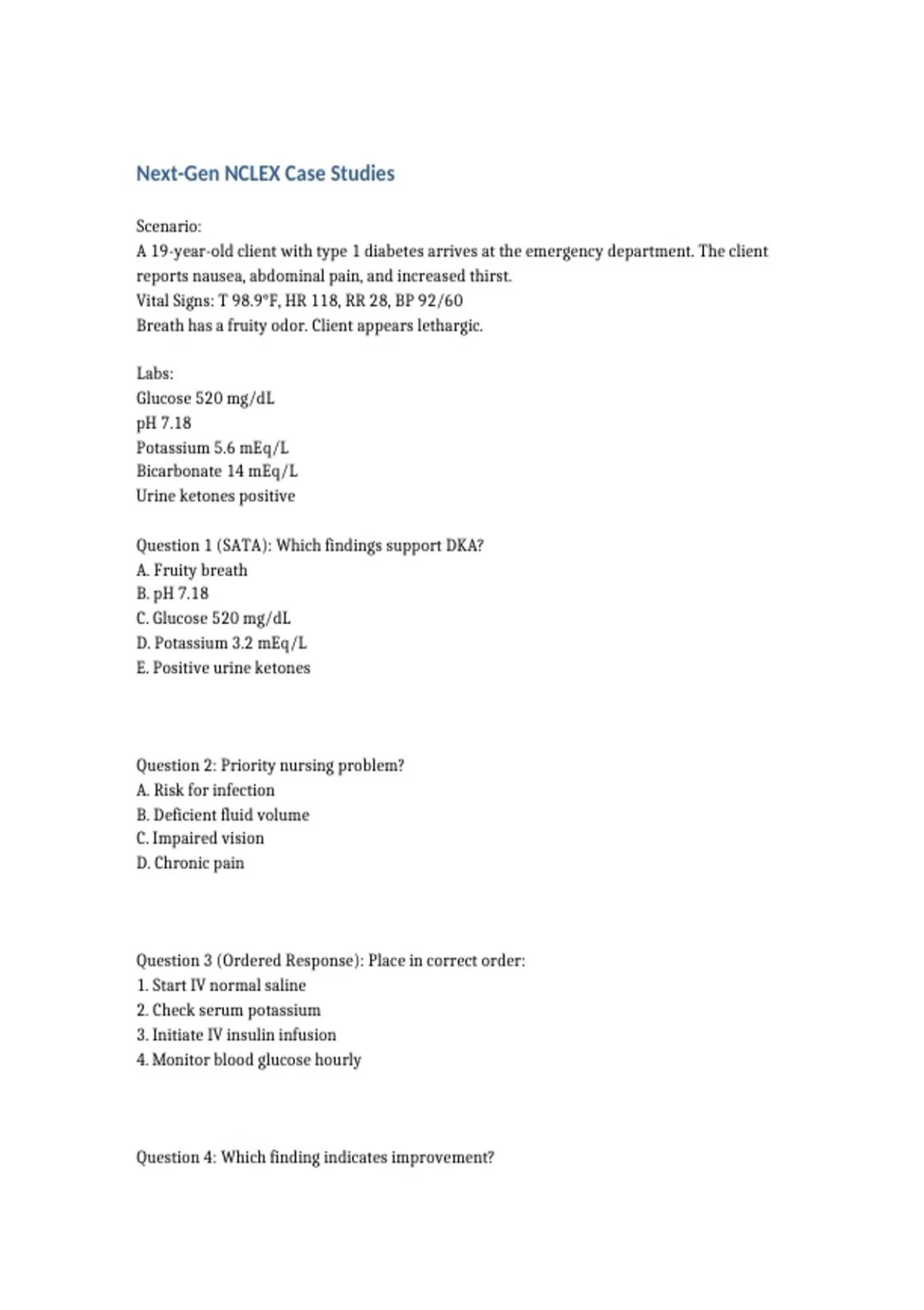 Next-Gen NCLEX Case Studies Scenario: A 19-year-old client with type 1 diabetes arrives at the emergency department. The client reports nausea, abdominal pain, and increased thirst. Vital Signs: T 98.9°F, HR 118, RR 28, BP 92/60 Breath has a fruity odor. Client appears lethargic. Labs: Glucose 520 mg/dL pH 7.18 Potassium 5.6 mEq/L Bicarbonate 14 mEq/L Urine ketones positive Question 1 (SATA): Which findings support DKA? A. Fruity breath B. pH 7.18 C. Glucose 520 mg/dL D. Potassium 3.2 mEq/L E. Positive urine ketones