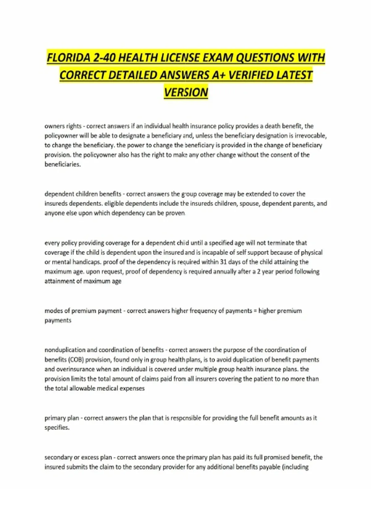 FLORIDA 2-40 HEALTH LICENSE EXAM QUESTIONS WITH CORRECT DETAILED ANSWERS A+ VERIFIED LATEST VERSION owners rights - correct answers if an individual health insurance policy provides a death benefit, the policyowner will be able to designate a beneficiary and, unless the beneficiary designation is irrevocable, to change the beneficiary. the power to change the beneficiary is provided in the change of beneficiary provision. the policyowner also has the right to make any other change without the consent of the beneficiaries. dependent children benefits - correct answers the group coverage may be extended to cover the insureds dependents. eligible dependents include the insureds children, spouse, dependent parents, and anyone else upon which dependency can be proven.
