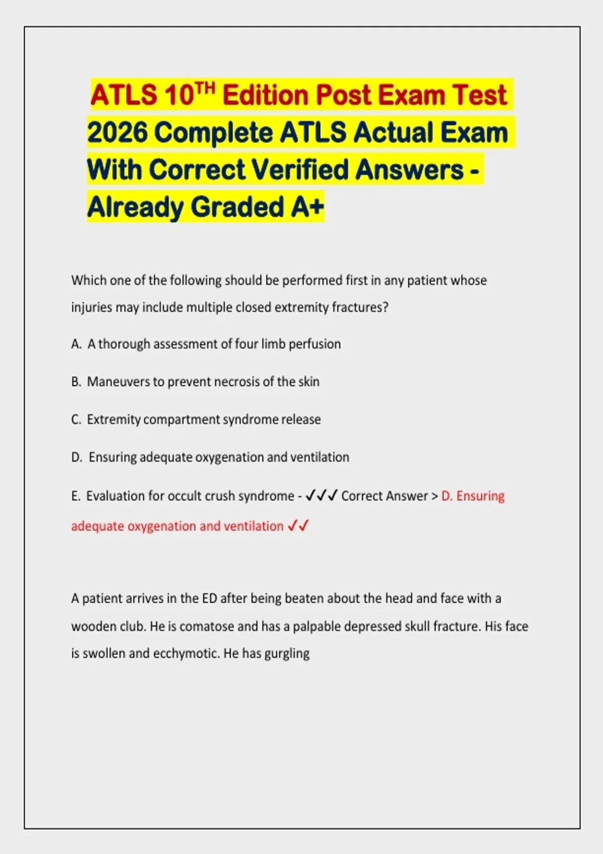 Dive into the ultimate preparation resource for mastering the Advanced Trauma Life Support (ATLS) certification with this comprehensive 2026 Post-Test Exam guide, featuring the complete set of actual questions alongside meticulously verified correct answers that have already earned a flawless A+ grade. Designed for medical professionals, residents, and students navigating the high-stakes world of trauma care, this highlighted PDF spans critical scenarios from initial patient assessment and airway management to complex cases involving hemorrhagic shock, pediatric injuries, and neurosurgical emergencies, ensuring you grasp essential concepts like prioritizing oxygenation in multi-fracture patients or operative control of internal bleeding. Whether you're gearing up for exams, refining your clinical decision-making, or seeking real-world application through detailed explanations and rationales, this resource empowers you to confidently tackle life-saving protocols, transform theoretical knowledge into practical expertise, and excel in delivering top-tier trauma interventions that could make all the difference in the ER.