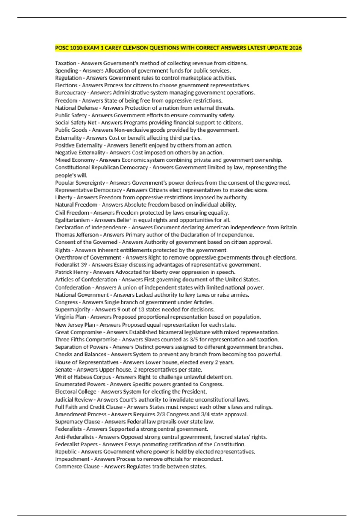 POSC 1010 EXAM 1 CAREY CLEMSON QUESTIONS WITH CORRECT ANSWERS LATEST UPDATE 2026 Taxation - Answers Government's method of collecting revenue from citizens. Spending - Answers Allocation of government funds for public services. Regulation - Answers Government rules to control marketplace activities. Elections - Answers Process for citizens to choose government representatives. Bureaucracy - Answers Administrative system managing government operations. Freedom - Answers State of being free from oppressive restrictions. National Defense - Answers Protection of a nation from external threats. Public Safety - Answers Government efforts to ensure community safety. Social Safety Net - Answers Programs providing financial support to citizens. Public Goods - Answers Non-exclusive goods provided by the government. Externality - Answers Cost or benefit affecting third parties. Positive Externality - Answers Benefit enjoyed by others from an action. Negative Externality - Answers Cost imposed on others by an action. Mixed Economy - Answers Economic system combining private and government ownership. Constitutional Republican Democracy - Answers Government limited by law, representing the people's will. Popular Sovereignty - Answers Government's power derives from the consent of the governed. Representative Democracy - Answers Citizens elect representatives to make decisions. Liberty - Answers Freedom from oppressive restrictions imposed by authority. Natural Freedom - Answers Absolute freedom based on individual ability. Civil Freedom - Answers Freedom protected by laws ensuring equality. Egalitarianism - Answers Belief in equal rights and opportunities for all. Declaration of Independence - Answers Document declaring American independence from Britain. Thomas Jefferson - Answers Primary author of the Declaration of Independence. Consent of the Governed - Answers Authority of government based on citizen approval. Rights - Answers Inherent entitlements protected by the government. Overthrow of Government - Answers Right to remove oppressive governments through elections. Federalist 39 - Answers Essay discussing advantages of representative government. Patrick Henry - Answers Advocated for liberty over oppression in speech. Articles of Confederation - Answers First governing document of the United States. Confederation - Answers A union of independent states with limited national power. National Government - Answers Lacked authority to levy taxes or raise armies. Congress - Answers Single branch of government under Articles. Supermajority - Answers 9 out of 13 states needed for decisions. Virginia Plan - Answers Proposed proportional representation based on population. New Jersey Plan - Answers Proposed equal representation for each state. Great Compromise - Answers Established bicameral legislature with mixed representation. Three Fifths Compromise - Answers Slaves counted as 3/5 for representation and taxation. Separation of Powers - Answers Distinct powers assigned to different government branches. Checks and Balances - Answers System to prevent any branch from becoming too powerful. House of Representatives - Answers Lower house, elected every 2 years. Senate - Answers Upper house, 2 representatives per state. Writ of Habeas Corpus - Answers Right to challenge unlawful detention.