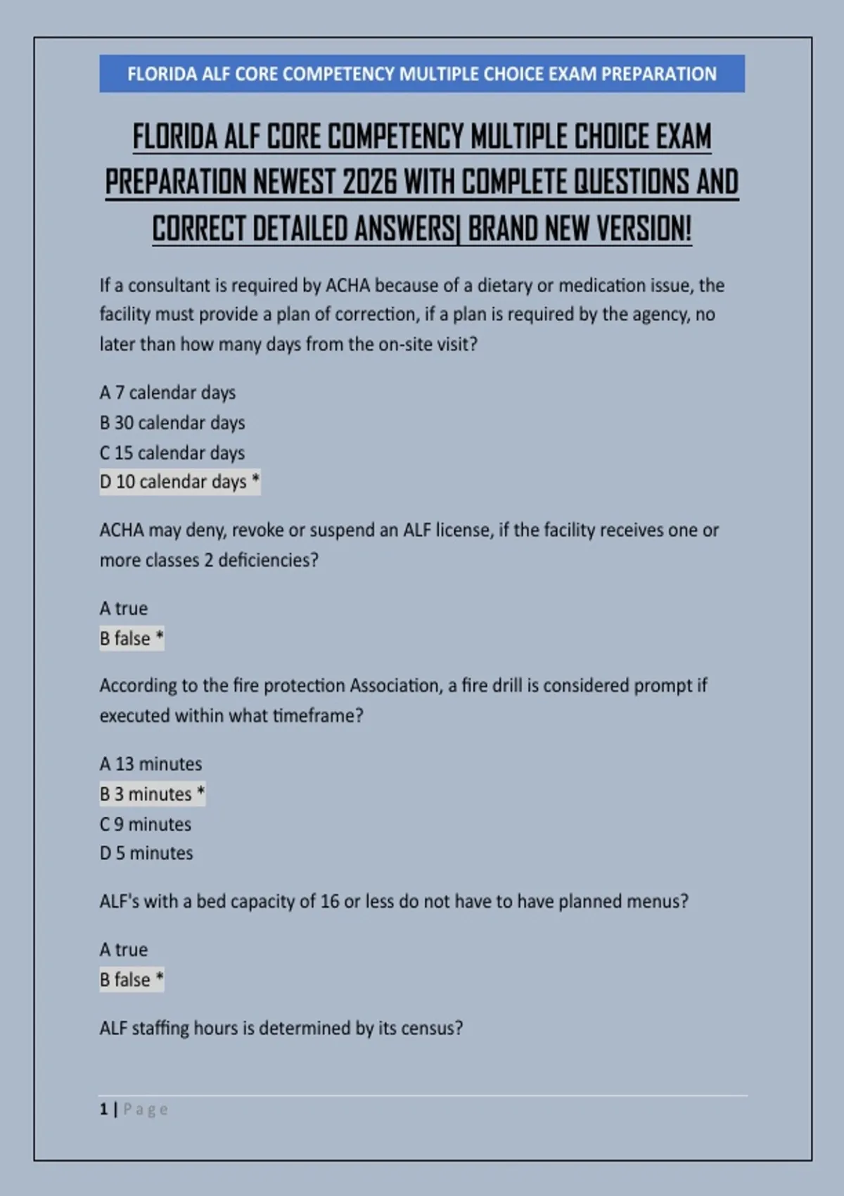 , FLORIDA ALF CORE COMPETENCY MULTIPLE CHOICE EXAM PREPARATION