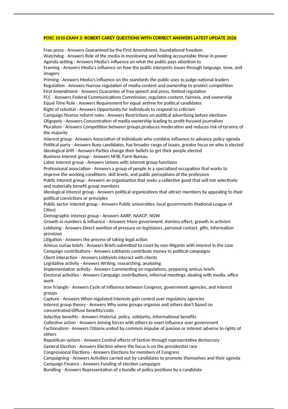 POSC 1010 EXAM 2- ROBERT CAREY QUESTIONS WITH CORRECT ANSWERS LATEST UPDATE 2026 Free press - Answers Guaranteed by the First Amendment, foundational freedom Watchdog - Answers Role of the media in monitoring and holding accountable those in power Agenda setting - Answers Media's influence on what the public pays attention to Framing - Answers Media's influence on how the public interprets issues through language, tone, and imagery Priming - Answers Media's influence on the standards the public uses to judge national leaders Regulation - Answers Narrow regulation of media content and ownership to protect competition First Amendment - Answers Guarantee of free speech and press, limited regulation FCC - Answers Federal Communications Commission, regulates content, fairness, and ownership Equal Time Rule - Answers Requirement for equal airtime for political candidates Right of rebuttal - Answers Opportunity for individuals to respond to criticism Campaign finance reform rules - Answers Restrictions on political advertising before elections Oligopoly - Answers Concentration of media ownership leading to profit-focused journalism Pluralism - Answers Competition between groups produces moderation and reduces risk of tyranny of the majority Interest group - Answers Association of individuals who combine influence to advance policy agenda Political party - Answers Runs candidates, has broader range of issues, greater focus on who is elected Ideological drift - Answers Parties change their beliefs to get their people elected Business interest group - Answers NFIB, Farm Bureau Labor interest group - Answers Unions with interest group functions Professional association - Answers a group of people in a specialized occupation that works to improve the working conditions, skill levels, and public perceptions of the profession Public interest group - Answers an organization that seeks a collective good that will not selectively and materially benefit group members Ideological interest group - Answers political organizations that attract members by appealing to their political convictions or principles Public sector interest group - Answers Public universities, local governments (National League of Cities) Demographic interest group - Answers AARP, NAACP, NOW Growth in numbers & influence - Answers More government, domino effect, growth in activism Lobbying - Answers Direct exertion of pressure on legislators, personal contact, gifts, information provision Litigation - Answers the process of taking legal action Amicus curiae briefs - Answers Briefs submitted to court by non-litigants with interest in the case Campaign contributions - Answers Lobbyists contribute money to political campaigns Client interaction - Answers Lobbyists interact with clients Legislative activity - Answers Writing, researching, analyzing Implementation activity - Answers Commenting on regulations, preparing amicus briefs Electoral activities - Answers Campaign contributions, informal meetings, dealing with media, office work Iron Triangle - Answers Cycle of influence between Congress, government agencies, and interest groups Capture - Answers When regulated interests gain control over regulatory agencies Interest group theory - Answers Why some groups organize and others don't based on concentrated/diffuse benefits/costs Selective benefits - Answers Material, policy, solidarity, informational benefits Collective action - Answers Joining forces with others to exert influence over government Factionalism - Answers Citizens united by common impulse of passion or interest adverse to rights of others Republican system - Answers Control effects of faction through representative democracy General Election - Answers Election where the focus is on the presidential race Congressional Elections - Answers Elections for members of Congress Campaigning - Answers Activities carried out by candidates to promote themselves and their agenda Campaign Finance - Answers Funding of election campaigns Bundling - Answers Representation of a bundle of policy positions by a candidate Election Basics - Answers Fundamental principles and requirements of elections Runoff - Answers Second election held when no candidate wins a majority Majority - Answers More than 50% of the votes Plurality System - Answers System where the candidate with the most votes wins, even if it's less than 50% State Election Laws - Answers Laws established by each state to govern their own elections Primary System - Answers System of selecting candidates through party conventions and popular vote Party Convention - Answers Gathering of party members to nominate candidates Precinct Meeting - Answers Meeting where voters have the opportunity to become delegates to the county convention County Convention - Answers Convention that elects delegates to the state convention and nominates candidates for local office State Convention - Answers Convention that nominates candidates for statewide offices and delegates to the national convention