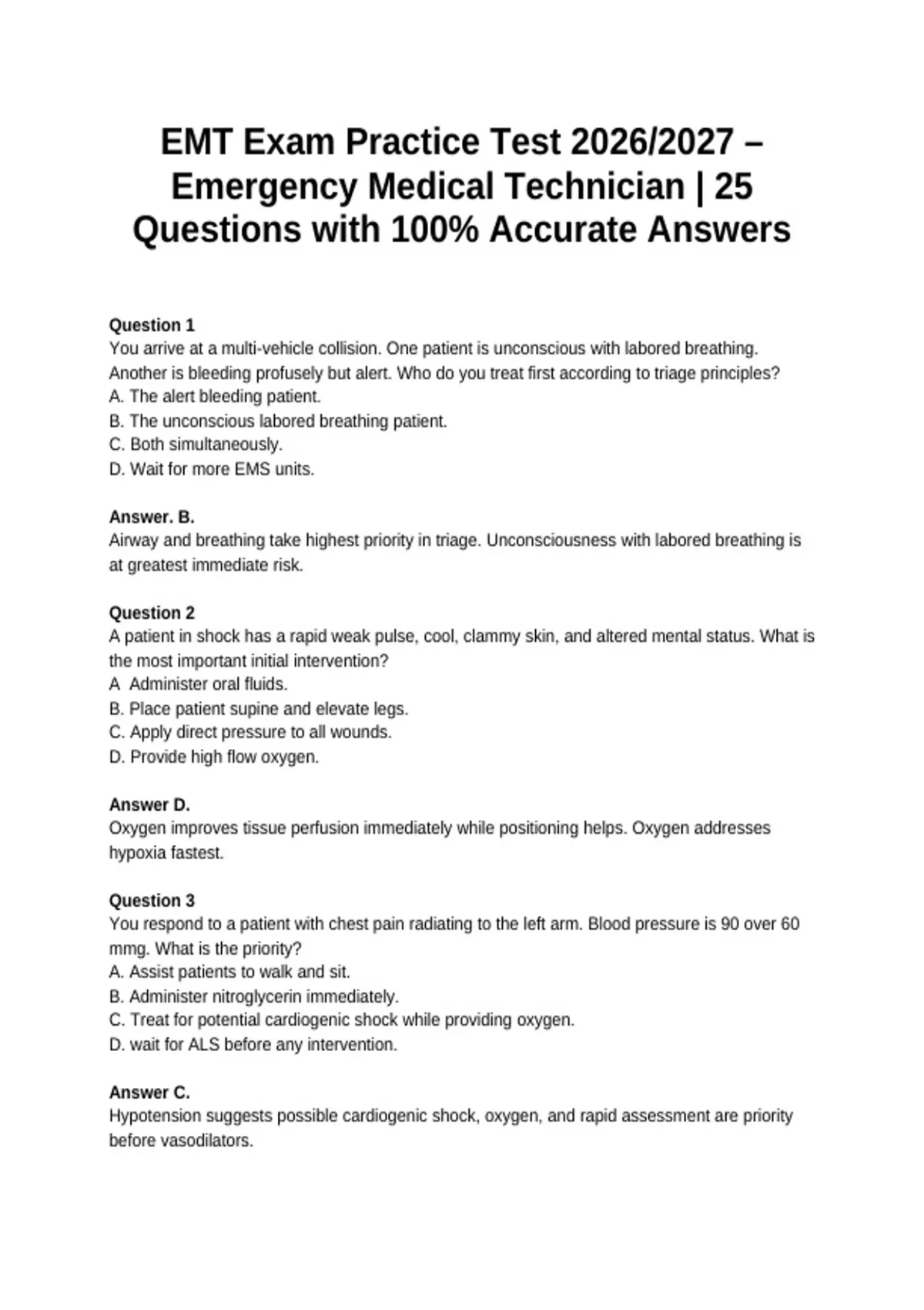 Prepare with confidence for the Emergency Medical Technician (EMT) Exam using this 2026/2027 latest updated practice test. This document includes 25 exam-style questions with 100% accurate, verified answers, graded A+, and aligned with current EMT and NREMT exam standards. Ideal for EMT students and candidates seeking reliable, up-to-date practice to improve understanding, boost exam readiness, and pass on the first attempt.