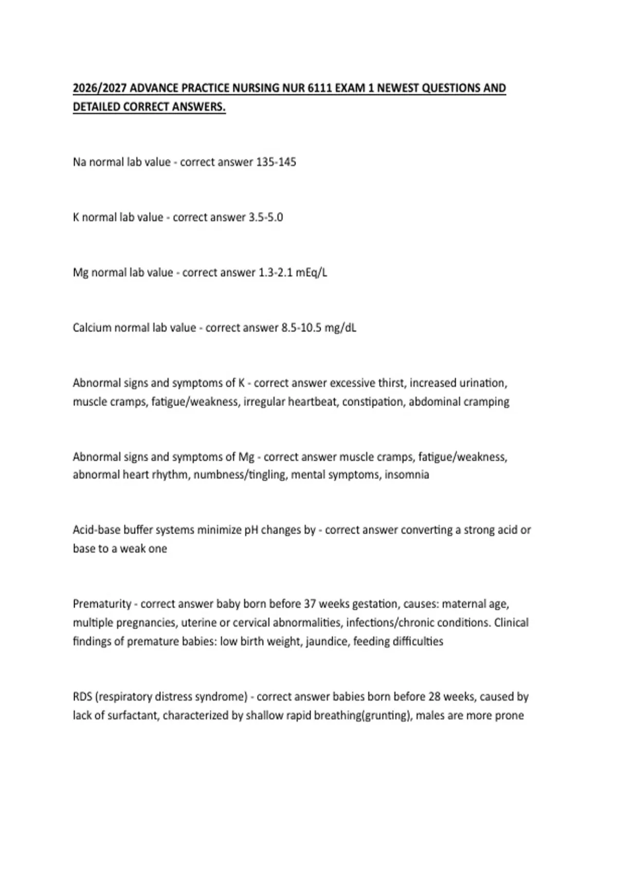 Na normal lab value - correct answer 135-145 K normal lab value - correct answer 3.5-5.0 Mg normal lab value - correct answer 1.3-2.1 mEq/L Calcium normal lab value - correct answer 8.5-10.5 mg/dL Abnormal signs and symptoms of K - correct answer excessive thirst, increased urination, muscle cramps, fatigue/weakness, irregular heartbeat, constipation, abdominal cramping Abnormal signs and symptoms of Mg - correct answer muscle cramps, fatigue/weakness, abnormal heart rhythm, numbness/tingling, mental symptoms, insomnia Acid-base buffer systems minimize pH changes by - correct answer converting a strong acid or base to a weak one Prematurity - correct answer baby born before 37 weeks gestation, causes: maternal age, multiple pregnancies, uterine or cervical abnormalities, infections/chronic conditions. Clinical findings of premature babies: low birth weight, jaundice, feeding difficulties RDS (respiratory distress syndrome) - correct answer babies born before 28 weeks, caused by lack of surfactant, characterized by shallow rapid breathing(grunting), males are more prone