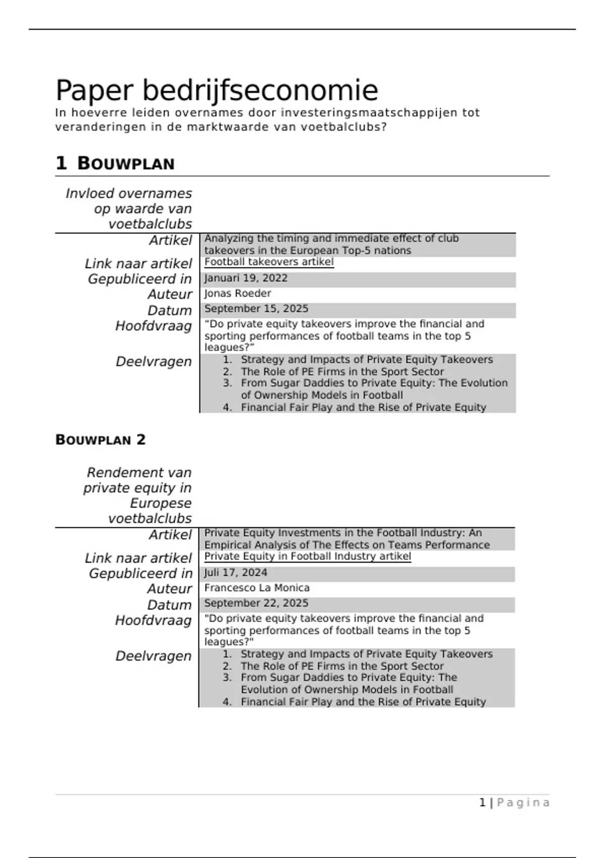 Dit document onderzoekt hoe overnames door investeringsmaatschappijen de marktwaarde van voetbalclubs beïnvloeden. Het combineert theoretische inzichten uit academische literatuur met concrete voorbeelden uit Europese topcompetities, waaronder een uitgebreide casestudy van Manchester City. Het onderzoek beschrijft zowel korte- als langetermijneffecten van overnames op clubwaarde, transfers, salarisstructuren en commerciële inkomsten. Het laat zien dat directe waardestijgingen meestal optreden rond het moment van de overname, maar dat duurzame groei afhankelijk is van strategische investeringen, stabiel bestuur, solide financiën en sportieve continuïteit. Daarnaast bespreekt het document verschillende investeringsstrategieën, eigendomsstructuren en de rol van private equity in het voetbal, en biedt het inzichten voor zowel academici als praktijkprofessionals over waardecreatie in de sportindustrie.