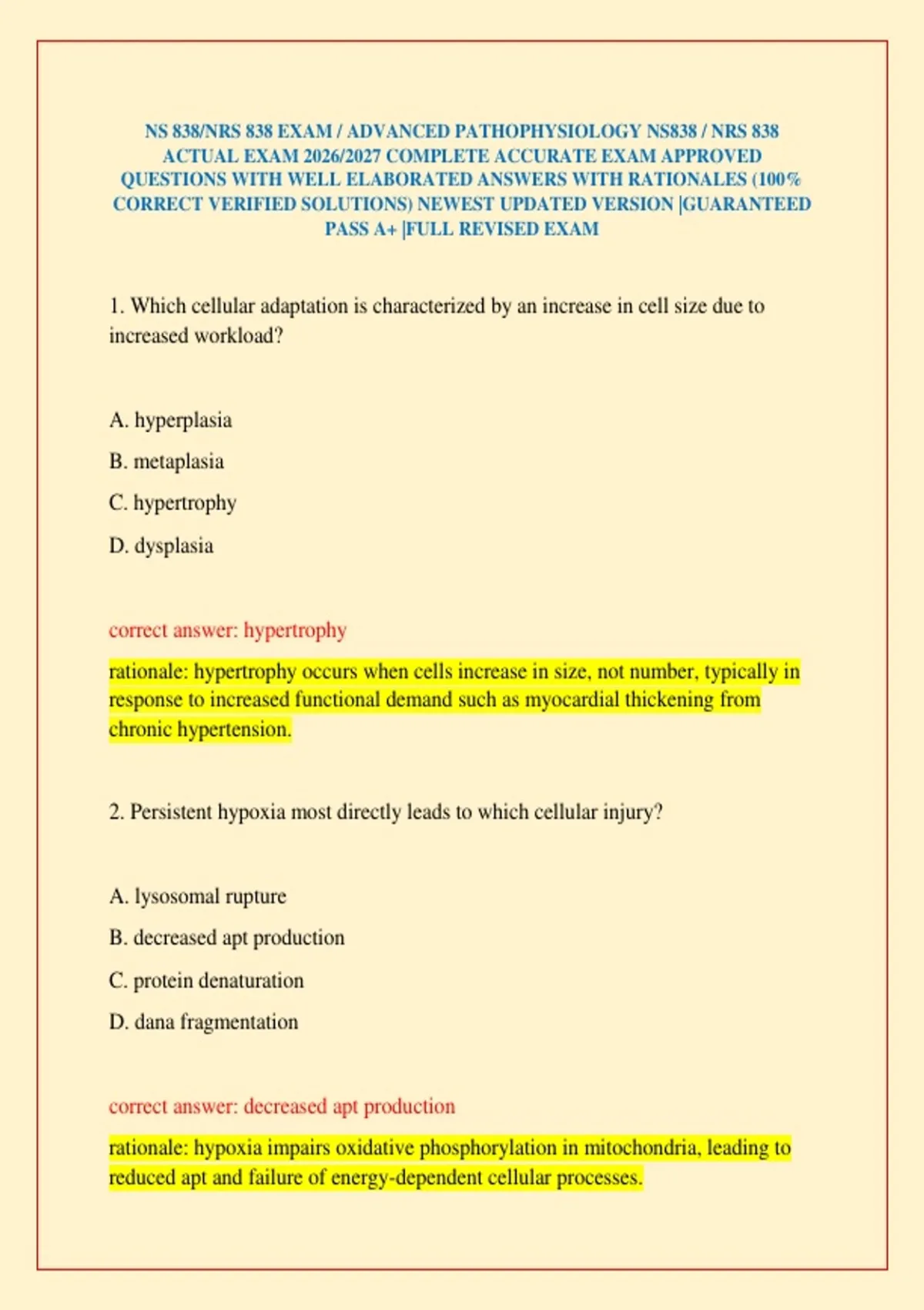 NS 838/NRS 838 EXAM / ADVANCED PATHOPHYSIOLOGY NS838 / NRS 838 ACTUAL EXAM 2026/2027 COMPLETE ACCURATE EXAM APPROVED QUESTIONS WITH WELL ELABORATED ANSWERS WITH RATIONALES (100% CORRECT VERIFIED SOLUTIONS) NEWEST UPDATED VERSION |GUARANTEED PASS A+ |FULL