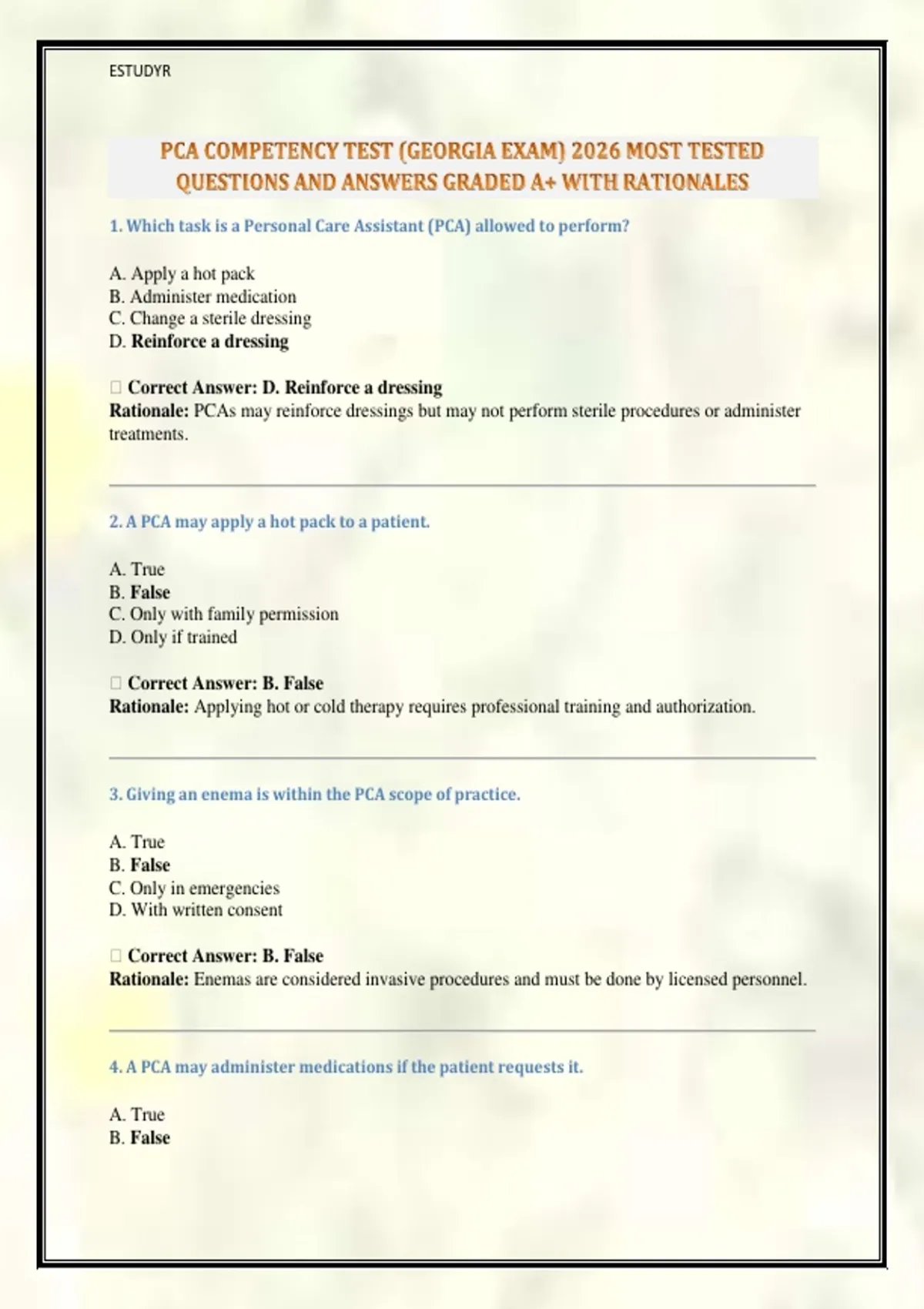 3. Giving an enema is within the PCA scope of practice.