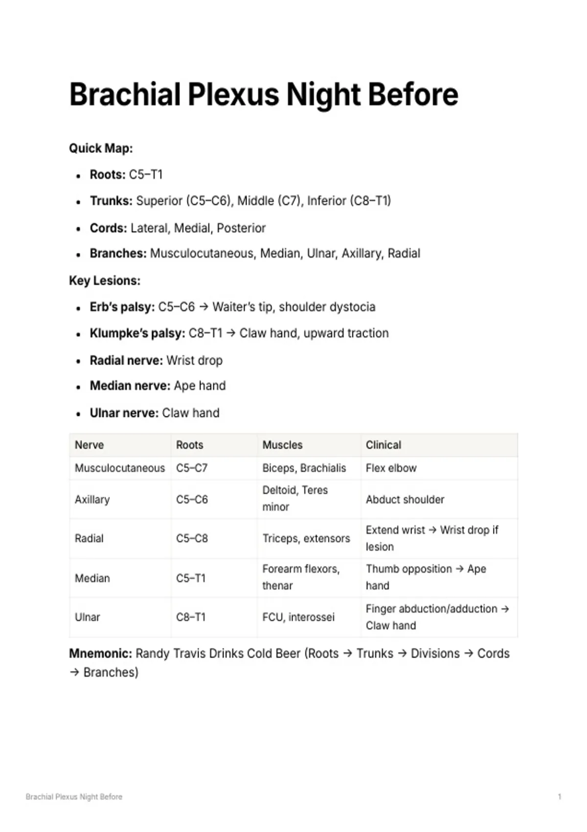 BRACHIAL PLEXUS – NIGHT BEFORE REVISION (HIGH-YIELD) Struggling to memorise the brachial plexus the night before your exam? These notes are specifically made for last-minute revision — clear, simplified, and exam-focused. What’s covered: Roots → Trunks → Divisions → Cords → Branches (made simple) Key terminal branches and innervation High-yield mnemonics to lock it in fast Clinical correlations & common exam questions Nerve injuries you’re expected to know (Erb’s, Klumpke’s, etc.)